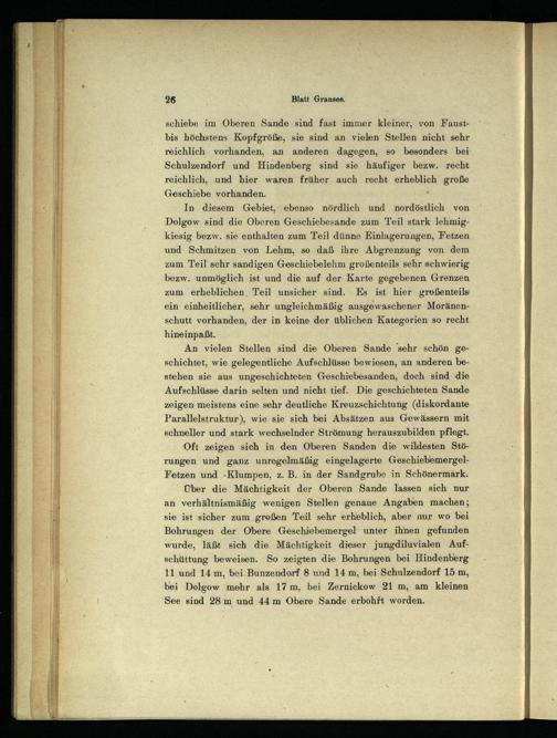 Über die Mächtigkeit der Oberen Sande lassen sich nur an verhältnismäßig wenigen Stellen genaue Angaben machen; sie ist sicher zum großen Teil sehr erheblich, aber nur wo bei Bohrungen der Obere Geschiebemergel unter ihnen gefunden wurde, läßt sich die Mächtigkeit dieser jungdiluvialen Aufschüttung beweisen. So zeigten die Bohrungen bei Hindenberg 11 und 14 m, bei Bunzendorf 8 und 14 m, bei Schulzendorf 15 m, bei Dolgow mehr als 17m, bei Zernickow 21 m, am kleinen See sind 28 m und 44m Obere Sande erbohft worden.
