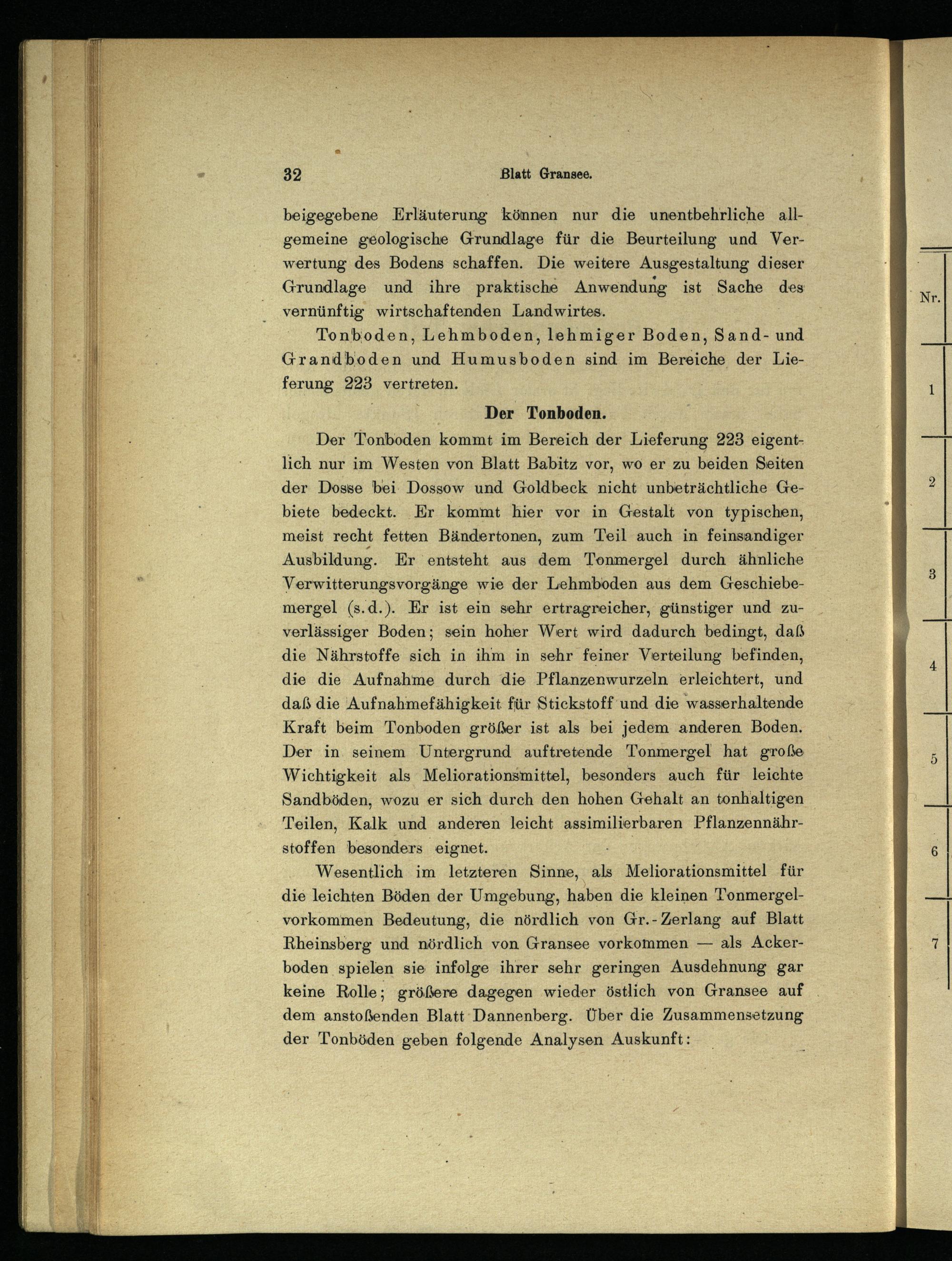 Der Tonboden kommt im Bereich der Lieferung 223 eigentlich nur im Westen von Blatt Babitz vor, wo er zu beiden Seiten der Dosse bei Dossow und Goldbeck nicht unbeträchtliche Gebiete bedeckt. Er kommt hier vor in Gestalt von typischen, meist recht fetten Bändertonen, zum Teil auch in feinsandiger Ausbildung. Er entsteht aus dem Tonmergel durch ähnliche Verwitterungsvorgänge wie der Lehmboden aus dem Geschiebemergel(s.d.). Er ist ein sehr ertragreicher, günstiger und zuverlässiger Boden; sein hoher Wert wird dadurch bedingt, daß die Nährstoffe sich in ihm in sehr feiner Verteilung befinden, die die Aufnahme durch die Pflanzenwurzeln erleichtert, und daß die Aufnahmefähigkeit für Stickstoff und die wasserhaltende Kraft beim Tonboden größer ist als bei jedem anderen Boden. Der in. seinem Untergrund auftretende Tonmergel hat große Wichtigkeit als Meliorationsmittel, besonders auch für leichte Sandböden, wozu er sich durch den hohen Gehalt an tonhaltigen Teilen, Kalk und anderen leicht assimilierbaren Pflanzennährstoffen besonders eignet. EN