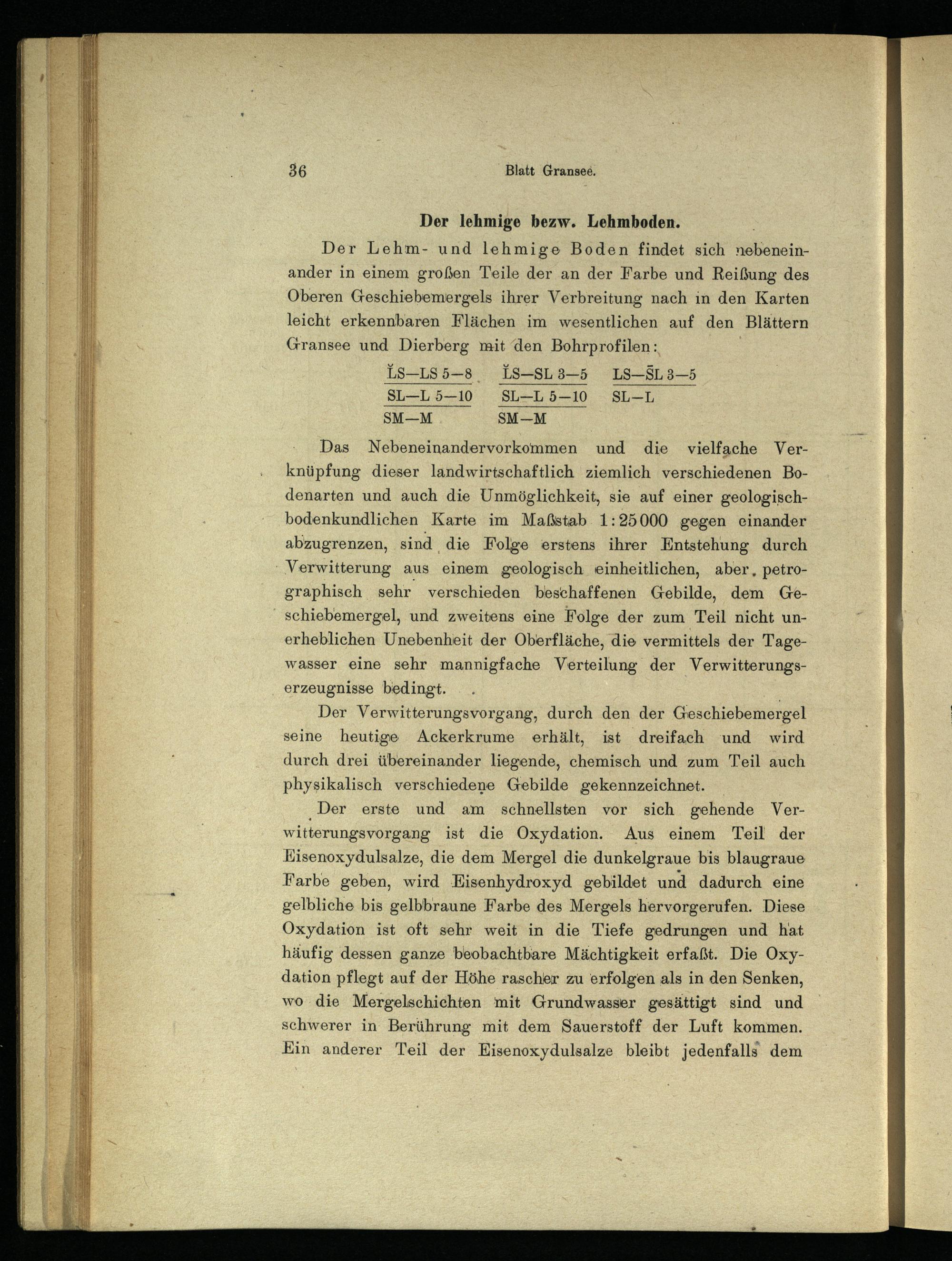 ‚Der erste und am schnellsten vor sich gehende Verwitterungsvorgang ist die Oxydation. Aus einem Teil der Kisenoxydulsalze, die dem Mergel die dunkelgraue bis blaugraue Farbe geben, wird HEisenhydroxyd gebildet und dadurch eine gelbliche bis gelbbraune Farbe des Mergels hervorgerufen. Diese Oxydation ist oft sehr weit in die Tiefe gedrungen und hat häufig dessen ganze beobachtbare Mächtigkeit erfaßt. Die Oxydation pflegt auf der Höhe rascher zu erfolgen als in den Senken, wo die Mergelschichten mit Grundwasser gesättigt sind und schwerer in Berührung mit dem Sauerstoff der Luft kommen. Ein anderer Teil der Eisenoxydulsalze bleibt jedenfalls dem
