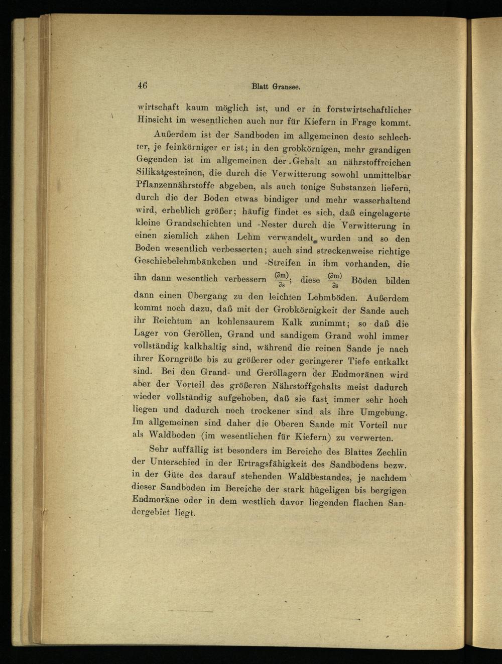 Sehr auffällig ist besonders im Bereiche des Blattes Zechlin der Unterschied in der Ertragsfähigkeit des Sandbodens bezw. in der Güte des darauf stehenden Waldbestandes; je nachdem dieser Sandboden im Bereiche der stark hügeligen bis bergigen Endmoräne oder in dem. westlich davor liegenden flachen Sandergebiet liegt.