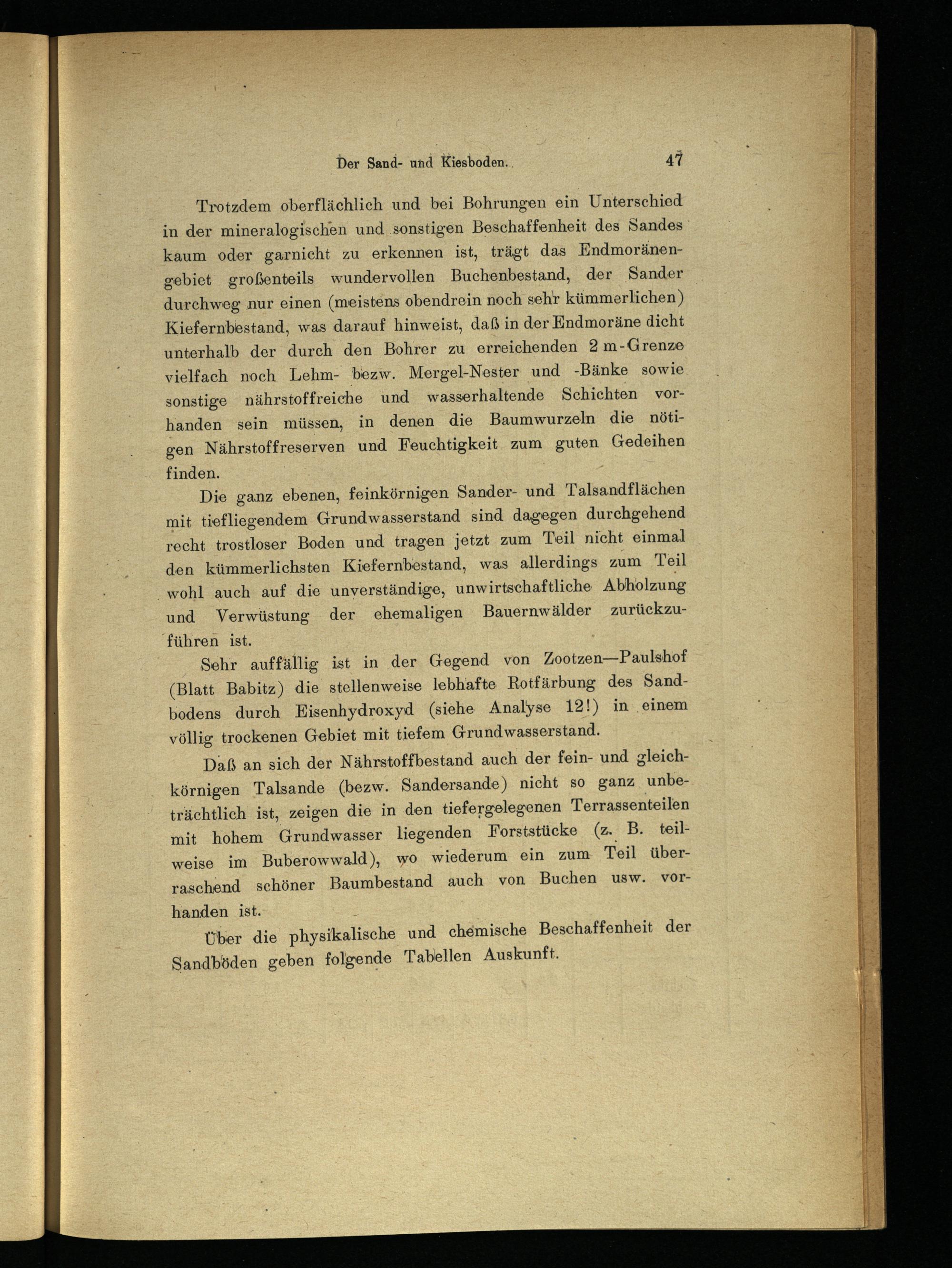 Trotzdem oberflächlich und bei Bohrungen ein Unterschied in der mineralogischen und ‚sonstigen Beschaffenheit des Sandes’ kaum oder garnicht zu erkennen ist, trägt das Endmoränengebiet großenteils wundervollen Buchenbestand, der Sander durchweg nur einen(meistens obendrein noch sehr kümmerlichen) Kiefernbestand, was darauf hinweist, daß in der Endmoräne dicht unterhalb der durch den Bohrer zu erreichenden 2 m-Grenze vielfach noch Lehm- bezw. Mergel-Nester und-Bänke sowie sonstige nährstoffreiche und wasserhaltende Schichten vorhanden sein müssen, in denen die Baumwurzeln die nötigen Nährstoffreserven und Feuchtigkeit zum guten Gedeihen finden.