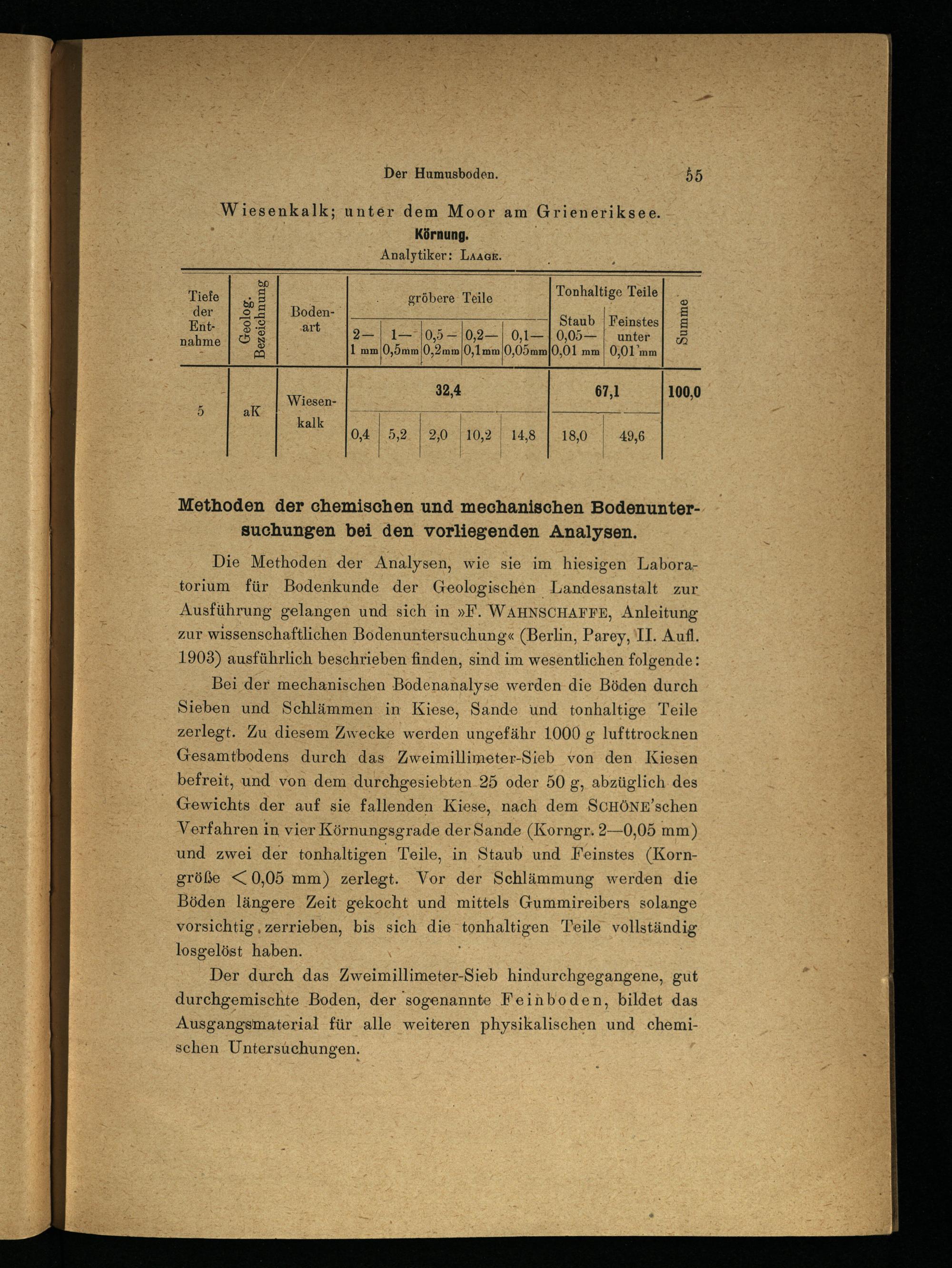 Die Methoden der Analysen, wie sie im hiesigen Laboratorium für Bodenkunde der Geologischen Landesanstalt zur Ausführung gelangen und sich in»F. WAHNSCHAFFE , Anleitung zur wissenschaftlichen Bodenuntersuchung«(Berlin , Parey, II. Aufl, 1908) ausführlich beschrieben finden, sind im wesentlichen folgende: