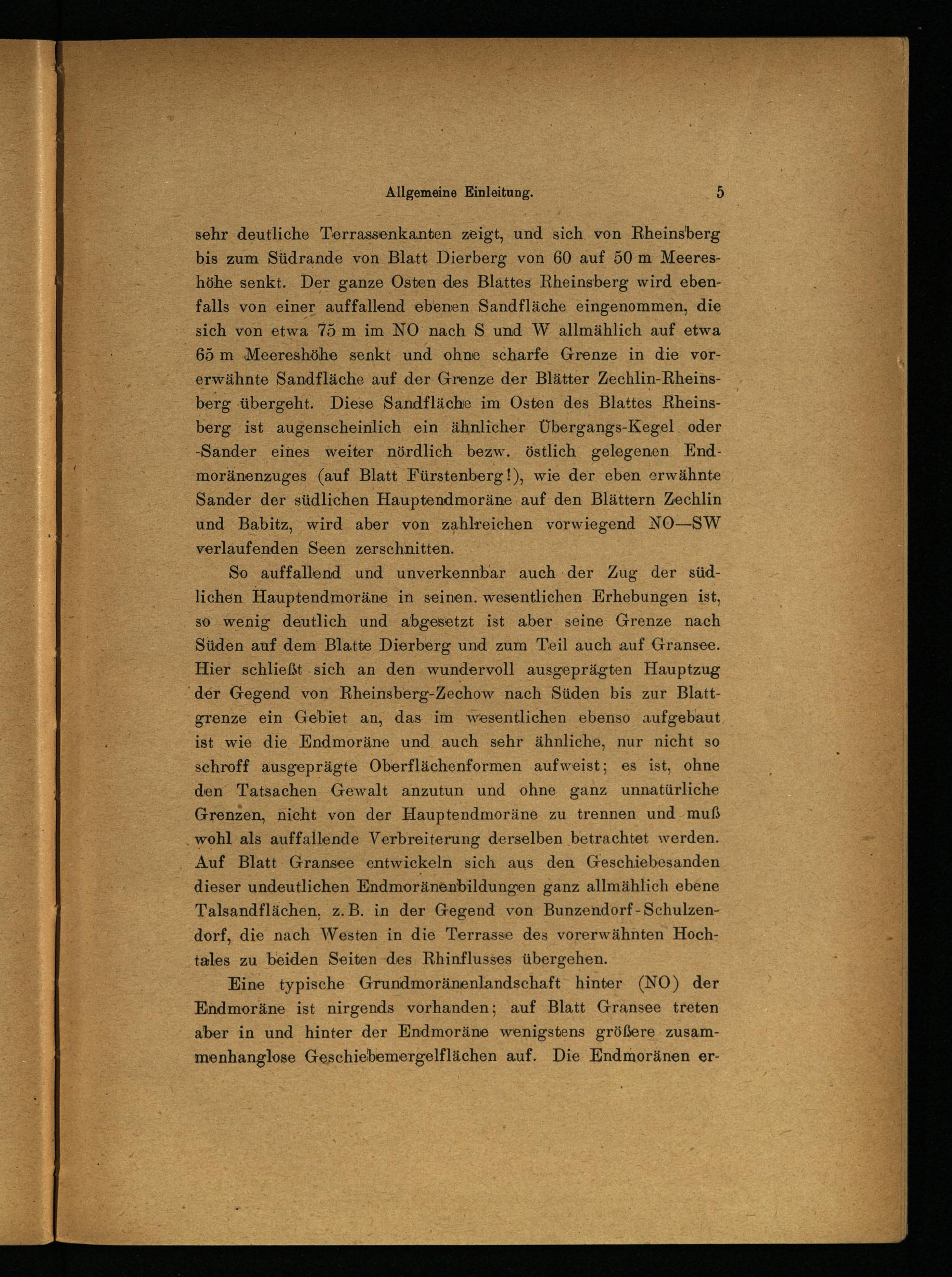sehr deutliche Terrassenkanten zeigt, und sich von Rheinsberg bis zum Südrande von Blatt Dierberg von 60 auf 50 m Meereshöhe senkt. Der ganze Osten des Blattes Rheinsberg wird ebenfalls von einer auffallend ebenen Sandfläche eingenommen, die sich von etwa 75 m im NO nach S und W allmählich auf etwa 65 m Meereshöhe senkt und ohne scharfe Grenze in die vorerwähnte Sandfläche auf der Grenze der Blätter Zechlin-Rheinsberg übergeht. Diese Sandfläche im Osten des Blattes Rheins berg ist augenscheinlich ein ähnlicher Übergangs-Kegel oder -Sander eines weiter nördlich bezw. östlich gelegenen Endmoränenzuges (auf Blatt Fürstenberg!), wie der eben erwähnte Sander der südlichen Hauptendmoräne auf den Blättern Zechlin und Babitz, wird aber von zahlreichen vorwiegend NO—SW verlaufenden Seen zerschnitten.