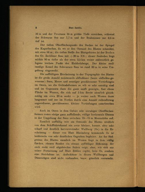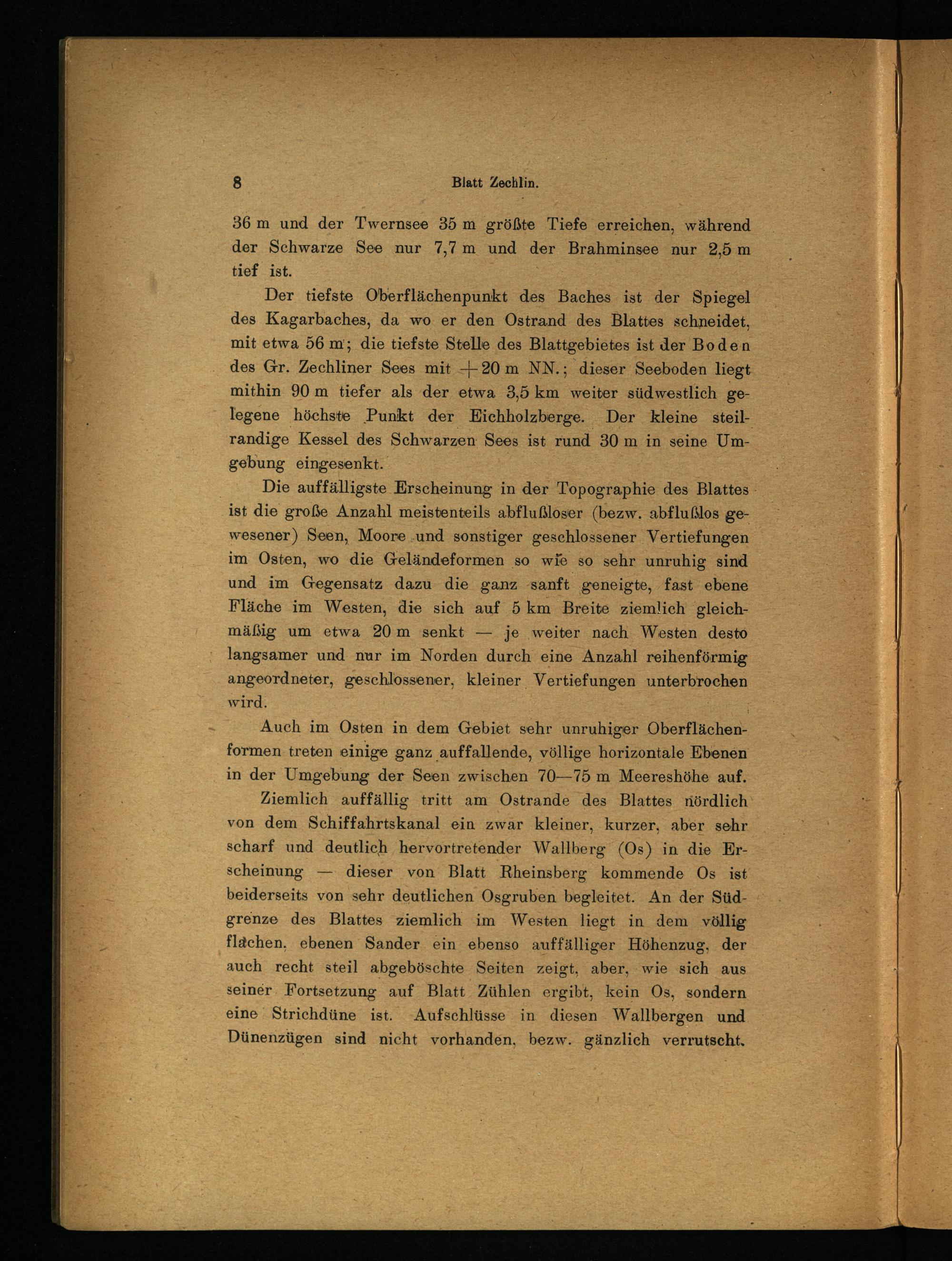Der tiefste Oberflächenpunkt des Baches ist der Spiegel des Kagarbaches, da wo er den Ostrand des Blattes schneidet, mit etwa 56 m; die tiefste Stelle des Blattgebietes ist der Boden des Gr. Zechliner Sees mit + 20 m NN.; dieser Seeboden liegt mithin 90 m tiefer als der etwa 3,5 km weiter südwestlich gelegene höchste Punkt der Eichholzberge. Der kleine steil- randige Kessel des Schwarzen Sees ist rund 30 m in seine Umgebung eingesenkt.