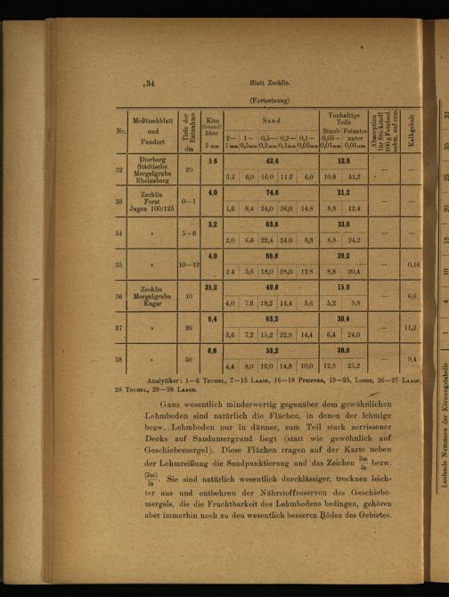 Ganz wesentlich minderwertig gegenüber dem gewöhnlichen Lehmboden sind natürlich die Flächen, in denen der lehmige bezw. Lehmboden nur in dünner, zum Teil stark zerrissener Decke auf Sanduntergrund liegt (statt wie gewöhnlich auf Geschiebemergel). Diese Flächen tragen auf der Karte neben der Lehmreißung die Sandpunktierung und das Zeichen — bezw. Sie sind natürlich wesentlich durchlässiger, trocknen leich-