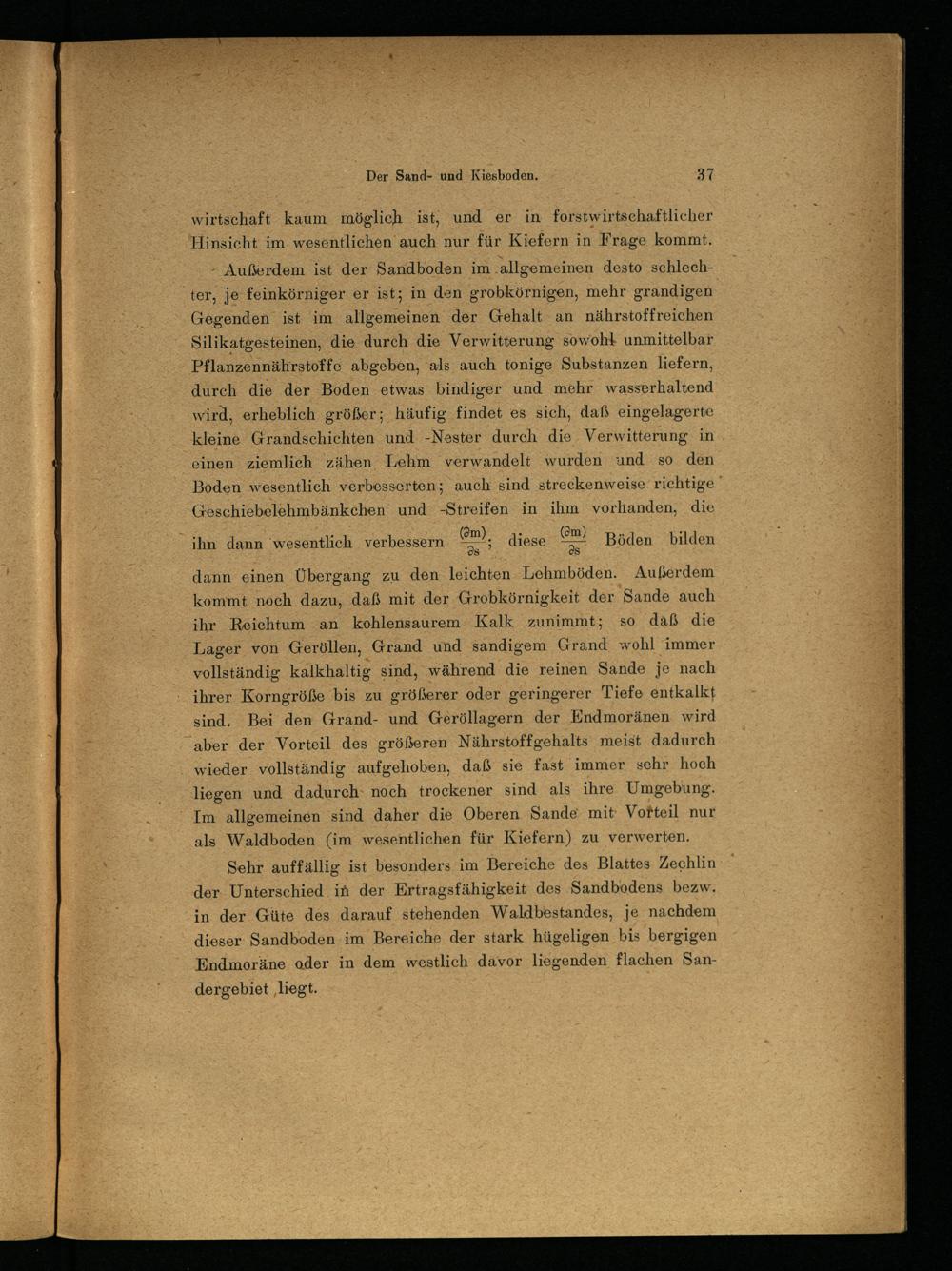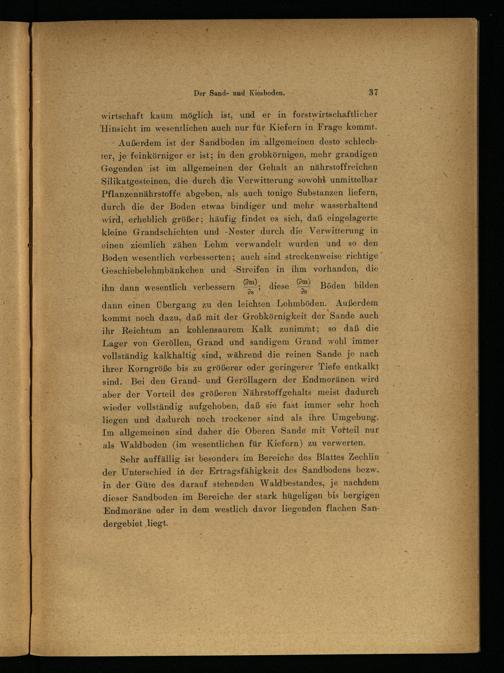 dann einen Übergang zu den leichten Lehmböden. Außerdem kommt noch dazu, daß mit der Grobkörnigkeit der Sande auch ihr Reichtum an kohlensaurem Kalk zunimmt; so daß die Lager von Geröllen, Grand und sandigem Grand wohl immer vollständig kalkhaltig sind, während die reinen Sande je nach ihrer Korngröße bis zu größerer oder geringerer Tiefe entkalkt sind. Bei den Grand- und Geröllagern der Endmoränen wird aber der Vorteil des größeren Nährstoffgehalts meist dadurch wieder vollständig aufgehoben, daß sie fast immer sehr hoch liegen und dadurch noch trockener sind als ihre Umgebung. Im allgemeinen sind daher die Oberen Sande mit Vorteil nur als Waldboden (im wesentlichen für Kiefern) zu verwerten.