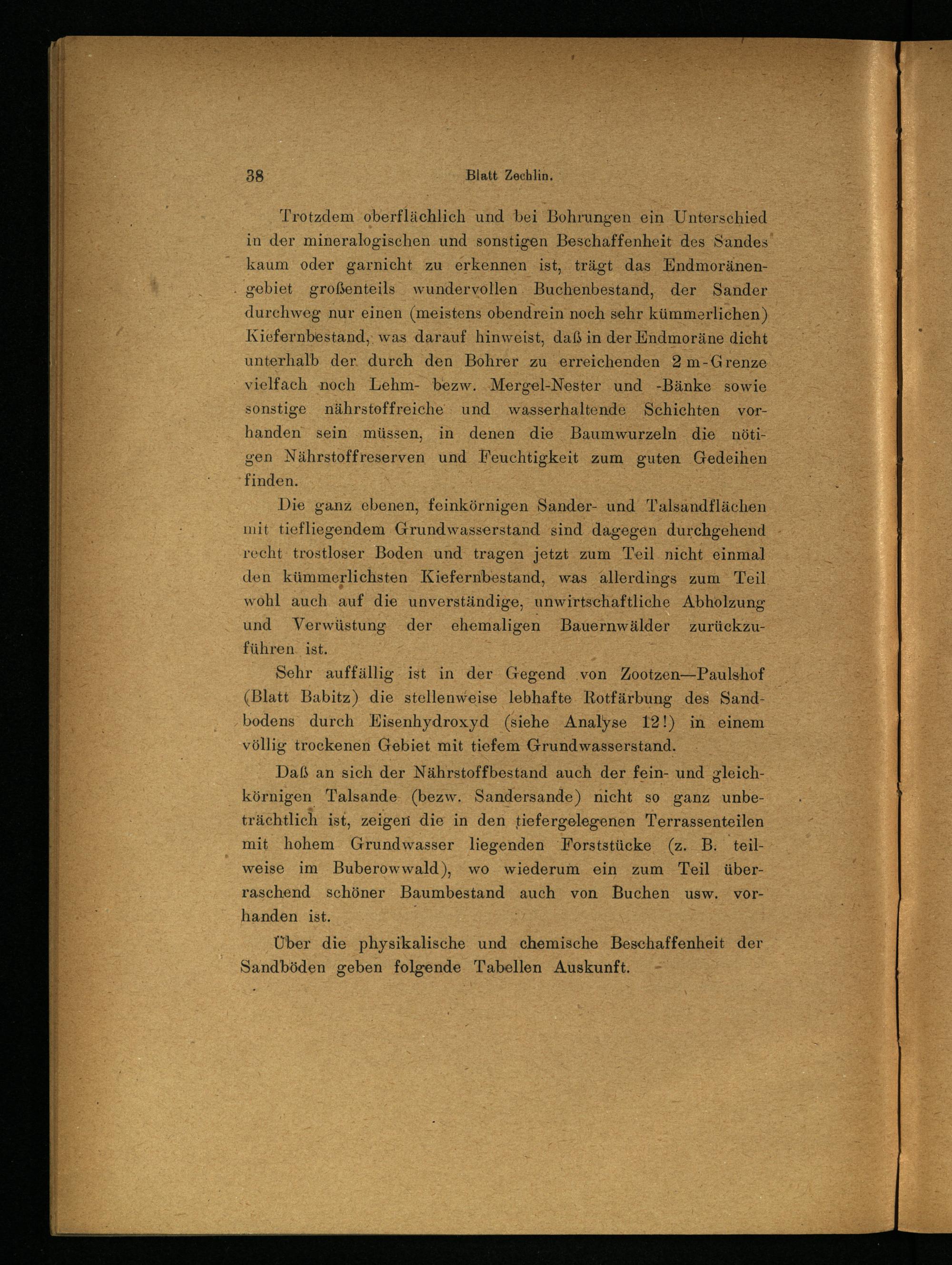Sehr auffällig ist in der Gegend von Zootzen—Paulshof (Blatt Babitz) die stellenweise lebhafte llotfärbung des Sandbodens durch Eisenhydroxyd (siehe Analyse 12!) in einem völlig trockenen Gebiet mit tiefem Grund wasserstand.