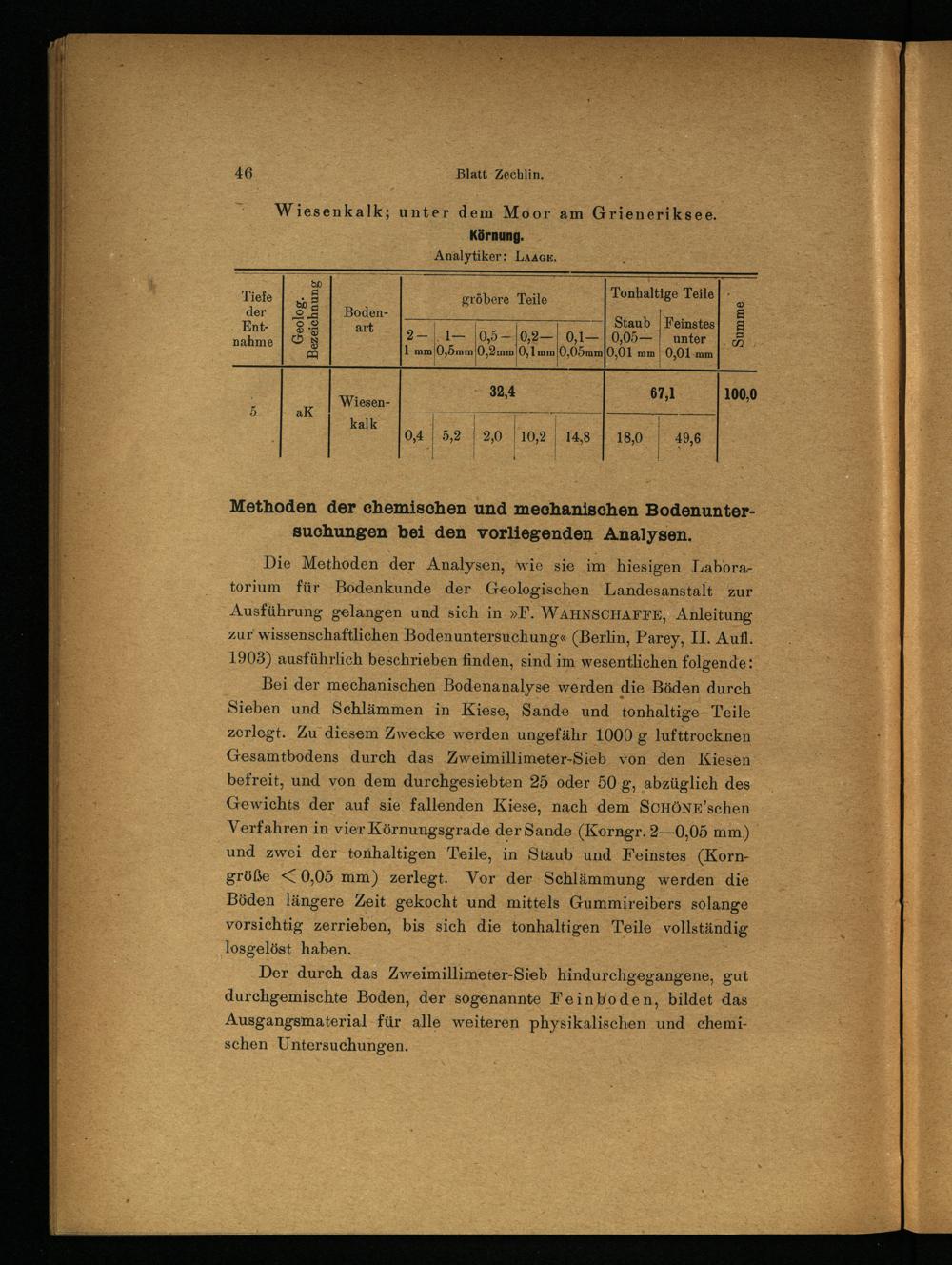 Die Methoden der Analysen, wie sie im hiesigen Laboratorium für Bodenkunde der Geologischen Landesanstalt zur Ausführung gelangen und sich in »F. WAHNSCHAFFE , Anleitung zur wissenschaftlichen Bodenuntersuchung« (Berlin , Parey, II. Aull. 1903) ausführlich beschrieben finden, sind im wesentlichen folgende;