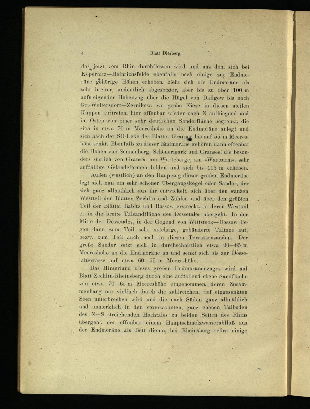 das jetzt vom Rhin durchflossen wird und aus dem sich bei Köpernitz—Heinrichsfelde ebenfalls noch einige zur Endmoräne gehörige Höhen erheben, zieht sich die Endmoräne als sehr breiter, undeutlich abgesetzter, aber bis zu über 100 m aufsteigender Höhenzug über die Hügel von Dallgow bis nach Gr.-Woltersdorf—Zernikow, wo grobe Kiese in diesen steilen Kuppen auftreten, hier offenbar wieder nach N aufbiegend und im Osten von einer sehr deutlichen Sanderfläche begrenzt, die sich in etwa 70 m Meereshöhe an die Endmoräne anlegt und sich nach der SO-Ecke des Blattes Gransee bis auf 55 in Meeres- höhe senkt. Ebenfalls zu dieser Endmoräne gehören dann offenbar die Höhen von Sonnenberg, Schönermark und Gransee die besonders südlich von Gransee am Warteberge, am »Wartturm«, sehr auffällige Geländeformen bilden und sich bis 115 m erheben.