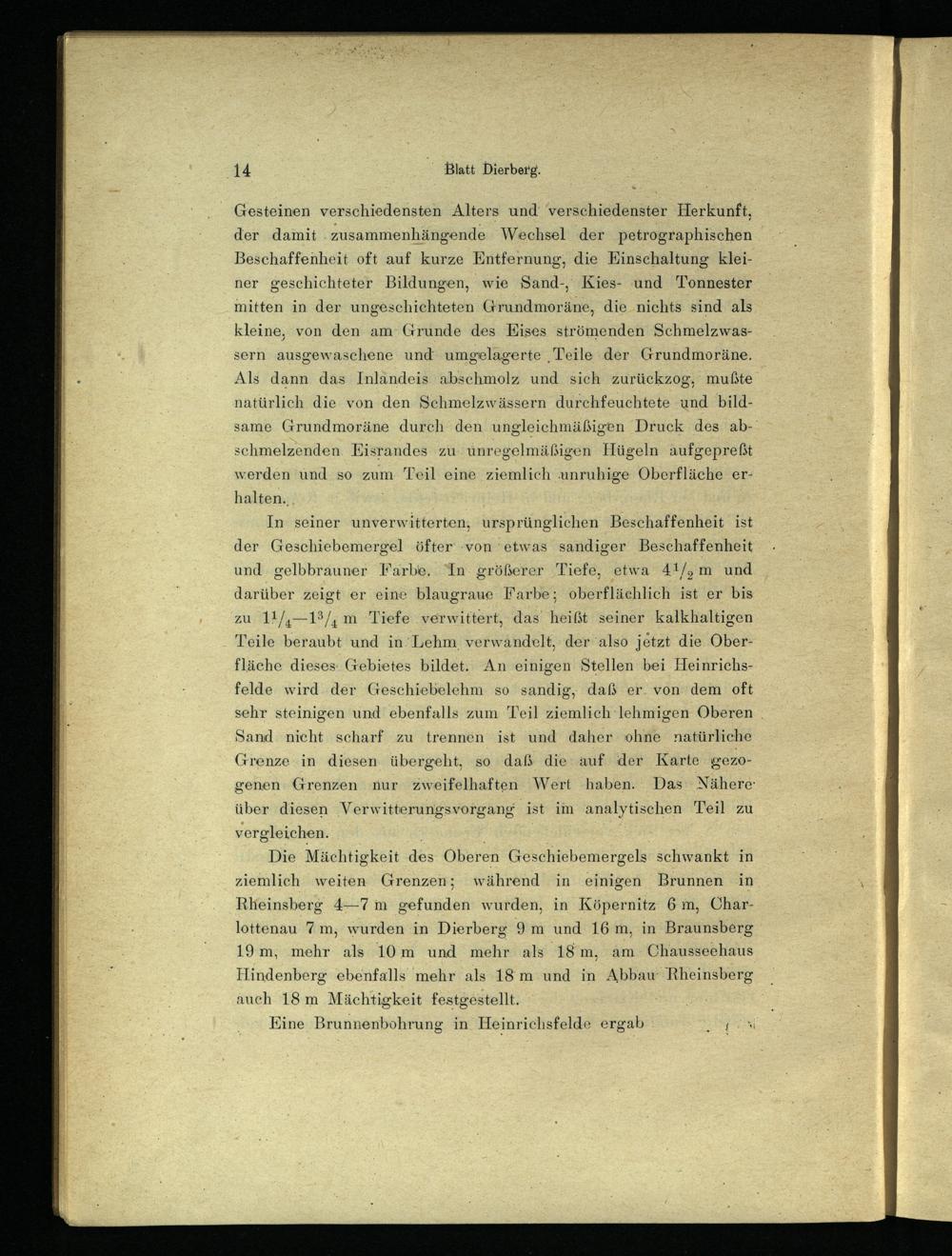 Die Mächtigkeit des Oberen Geschiebemergels schwankt in ziemlich weiten Grenzen; während in einigen Brunnen in Rheinsberg 4—7 m gefunden wurden, in Köpernitz 6 m, Char- lottenau 7 m, wurden in Dierberg 9 m und 16 m, in Braunsberg 19 m, mehr als 10 m und mehr als 18 m, am Chausseehaus Hindenberg ebenfalls mehr als 18 m und in Abbau Bheinsberg auch 18 m Mächtigkeit festgestellt.