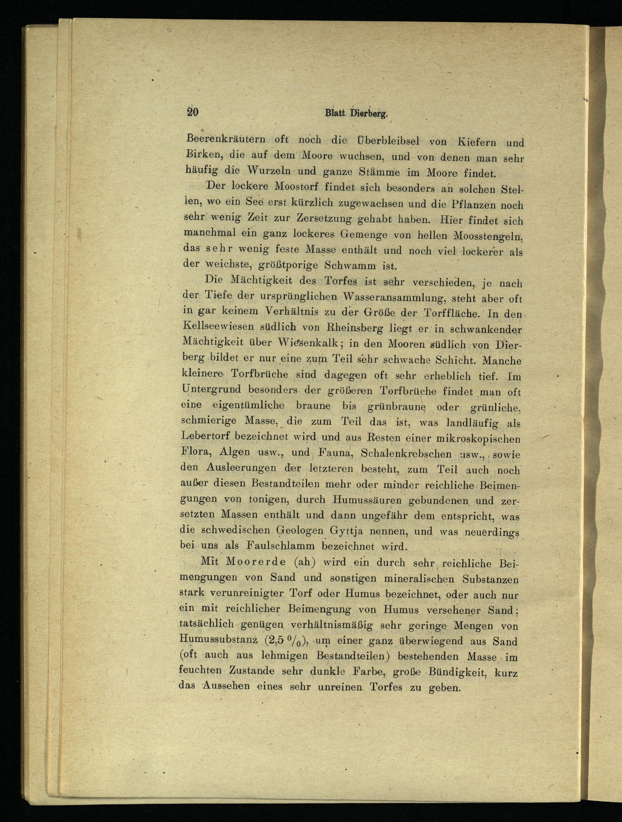 Die Mächtigkeit des Torfes ist sehr verschieden, je nach der Tiefe der ursprünglichen Wasseransammlung, steht aber oft in gar keinem Verhältnis zu der Größe der Torffläche. In den Kellseewiesen südlich von Rheinsberg liegt er in schwankender Mächtigkeit über Wiesenkalk; in den Mooren südlich von Dierberg bildet er nur eine zum Teil sehr schwache Schicht. Manche kleinere- Torfbrüche sind dagegen oft sehr erheblich tief. Im Untergrund besonders der größeren Torfbrüche findet man oft eine eigentümliche braune bis grünbraune oder grünliche, schmierige Masse, die zum Teil das ist, was landläufig als Lebertorf bezeichnet wird und aus Resten einer mikroskopischen Flora, Algen usw., und Fauna, Schalenkrebschen usw., sowie den Ausleerungen der letzteren besteht, zum Teil auch noch außer diesen Bestandteilen mehr oder minder reichliche Beimengungen von tonigen, durch Humussäuren gebundenen und zersetzten Massen enthält und dann ungefähr dem entspricht, was die schwedischen Geologen Gyttja nennen, und was neuerdings bei uns als Faulschlamm bezeichnet wird.