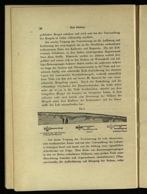 Der zweite Vorgang der Verwitterung ist die Auflösung und Entfernung der ursprünglich bis an die Oberfläche vorhandenen kohlensauren Salze der Kalkerde und Magnesia. Die mit Kohlensäure beladenen, in den Boden eindringenden Regenwasser lösen diese Stoffe. Einerseits werden sie alsdann seitlich fortgeführt und setzen sich in den Senken als Wiesenkalk und kalkige Beimengungen humoser Böden wieder ab, anderseits sickern sie längs der Spalten und Pflanzenwurzeln in die Tiefe und veranlassen häufig eine erhebliche Kalk-Anreicherung der obersten Lagen des unzersetzten Geschiebemergels, wodurch namentlich diese Teile von ihm sich am besten als Material für eine vorzunehmende Mergelung eignen. Durch die Entkalkung und die vollständige Oxydation der Eisenoxydulsalze, die beide selten mehr als l 1 / 2 m in die Tiefe herabreichen, entsteht aus dem lichtgelben Mergel ein brauner bis braunroter Lehm, in dem teilweise wohl auch bereits eine Zersetzung der Silikate des Mergels unter dem Einflüsse der Kohlensäure und des Sauerstoffs der Luft stattgefunden hat.