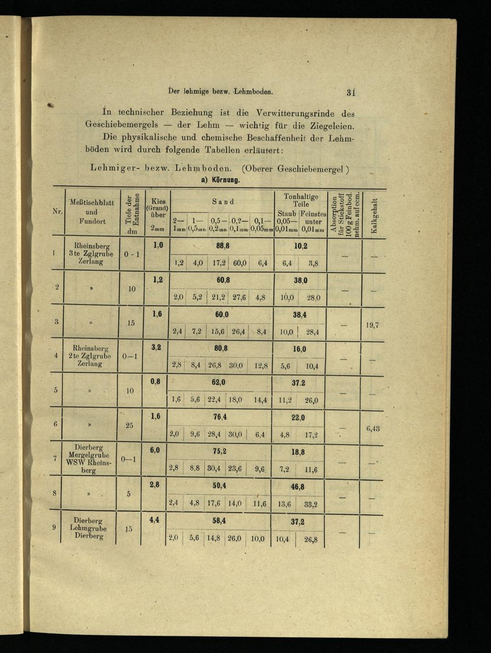 Die physikalische und chemische Beschaffenheit der Lehmböden wird durch folgende Tabellen erläutert: