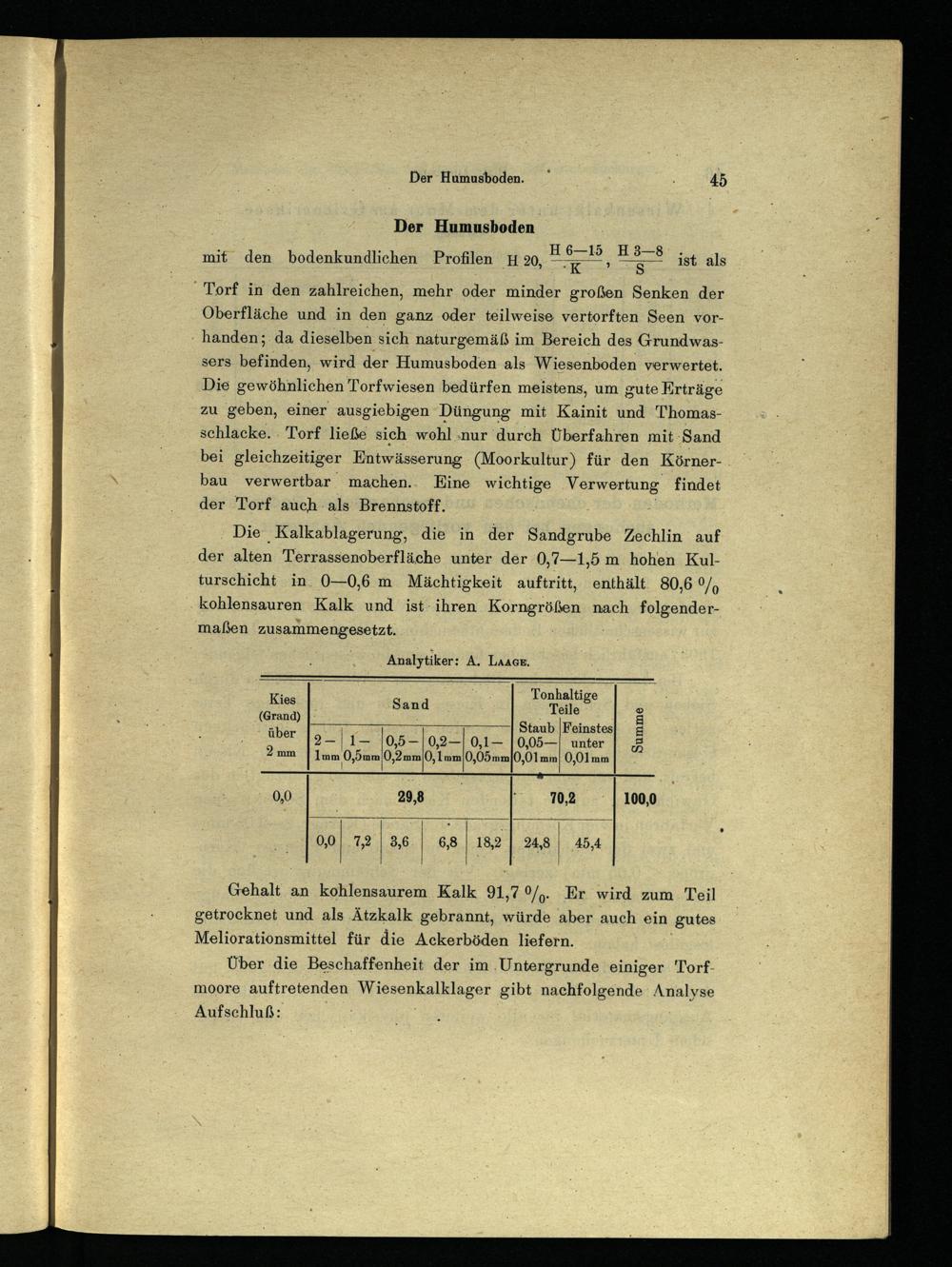 Die Kalkablagerung, die in der Sandgrube Zechlin auf der alten Terrassenoberfläche unter der 0,7—1,5 m hohen Kulturschicht in 0—0,6 m Mächtigkeit auftritt, enthält 80,6 °/ 0 kohlensauren Kalk und ist ihren Korngrößen nach folgendermaßen zusammengesetzt.