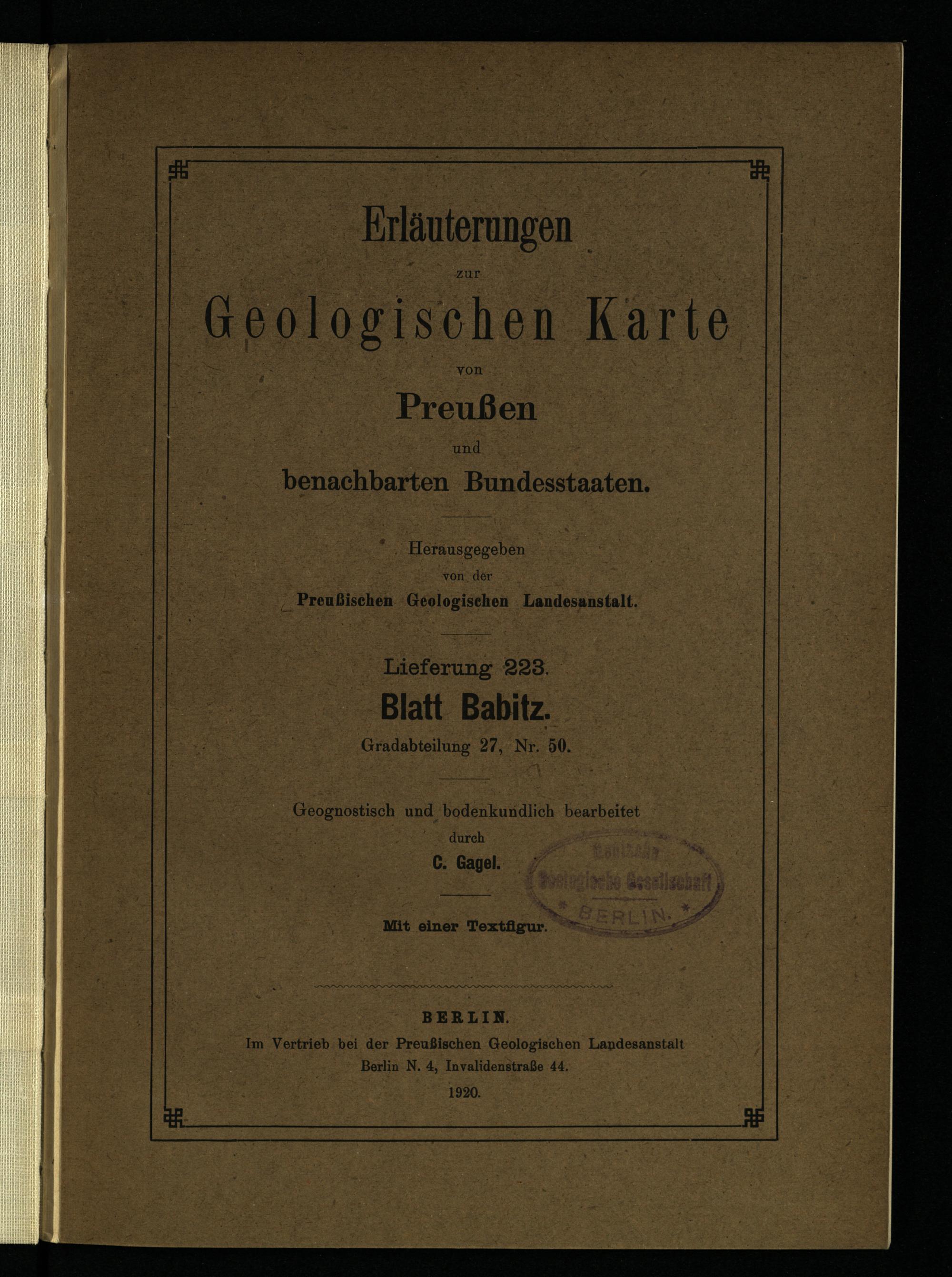 Im Vertrieb bei der Preußischen Geologischen Landesanstalt Berlin N. 4, Invalidenstraße 44.