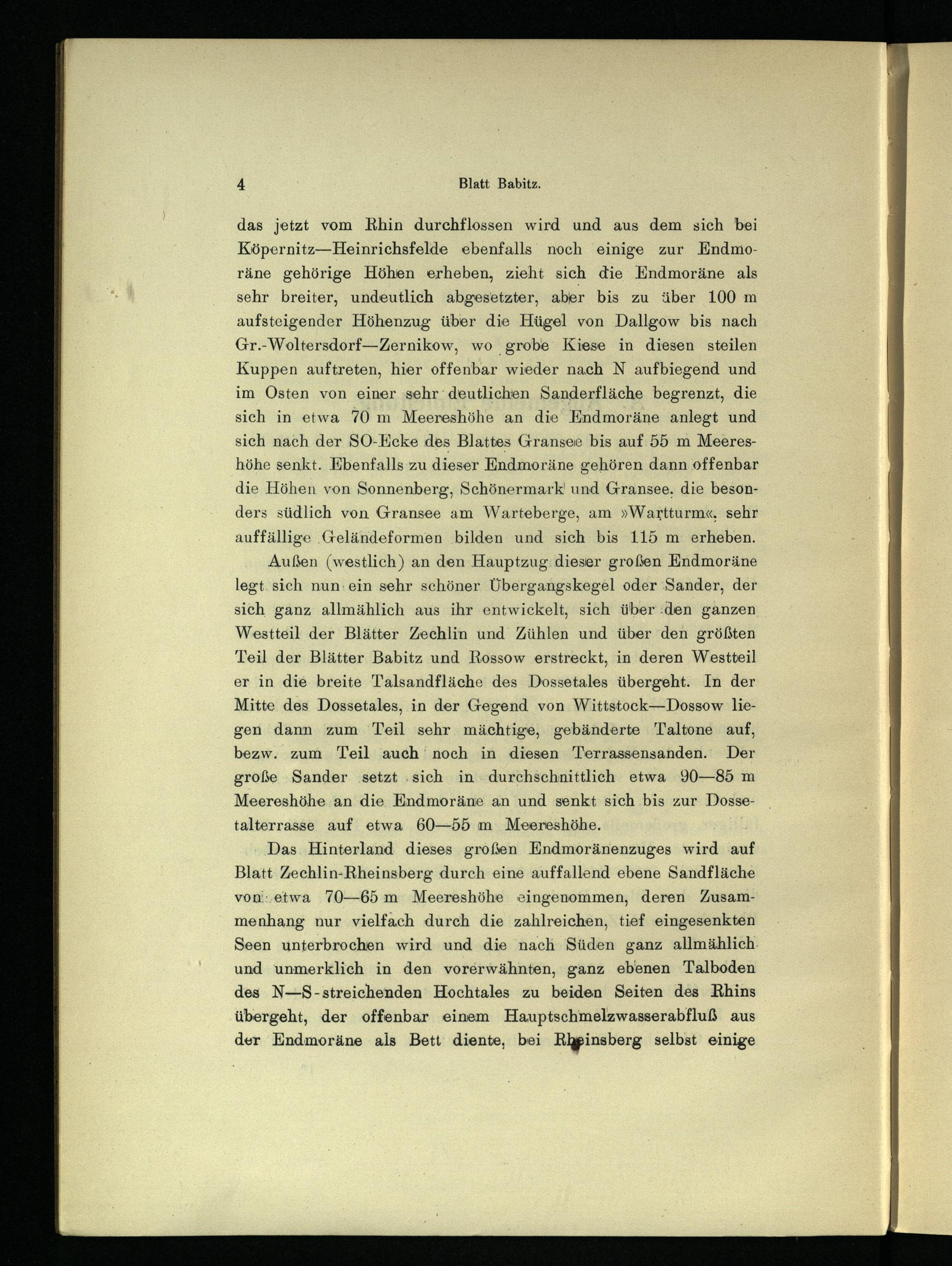 das jetzt vom Rhin durchflossen wird und aus dem sich bei Köpernitz—Heinrichsfelde ebenfalls noch einige zur Endmoräne gehörige Höhen erheben, zieht sich die Endmoräne als sehr breiter, undeutlich abgesetzter, aber bis zu über 100 m aufsteigender Höhenzug über die Hügel von Dallgow bis nach Gr.-Woltersdorf—Zernikow, wo grobe Kiese in diesen steilen Kuppen auftreten, hier offenbar wieder nach N aufbiegend und im Osten von einer sehr deutlichen Sanderfläche begrenzt, die sich in etwa 70 in Meereshöhe an die Endmoräne anlegt und sich nach der SO-Ecke des Blattes Gransee bis auf 55 m Meereshöhe senkt. Ebenfalls zu dieser Endmoräne gehören dann offenbar die Höhen von Sonnenberg, Schönermark und Gransee , die besonders südlich von Gransee am Warteberge, am »Wartturm«, sehr auffällige Geländeformen bilden und sich bis 115 m erheben.