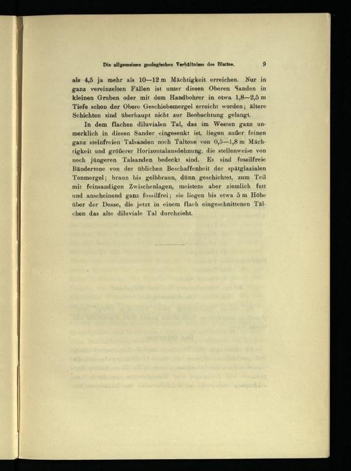 In dem flachen diluvialen Tal, das im Westen ganz unmerklich in diesen Sander eingesenkt ist, liegen außer feinen ganz steinfreien Talsanden noch Taltone von 0,5—1,8 m Mächtigkeit und größerer Horizontalausdehnung, die stellenweise von noch jüngeren Talsanden bedeckt sind. Es sind fossilfreie Bändertone von der üblichen Beschaffenheit der spätglazialen Tonmergel; braun bis gelbbraun, dünn geschichtet, zum Teil mit feinsandigen Zwischenlagen, meistens aber ziemlich fett und anscheinend ganz fossilfrei; sie liegen bis etwa 5 m Höhe über der Dosse, die jetzt in einem flach eingeschnittenen Täl- chen das alte diluviale Tal durchzieht.