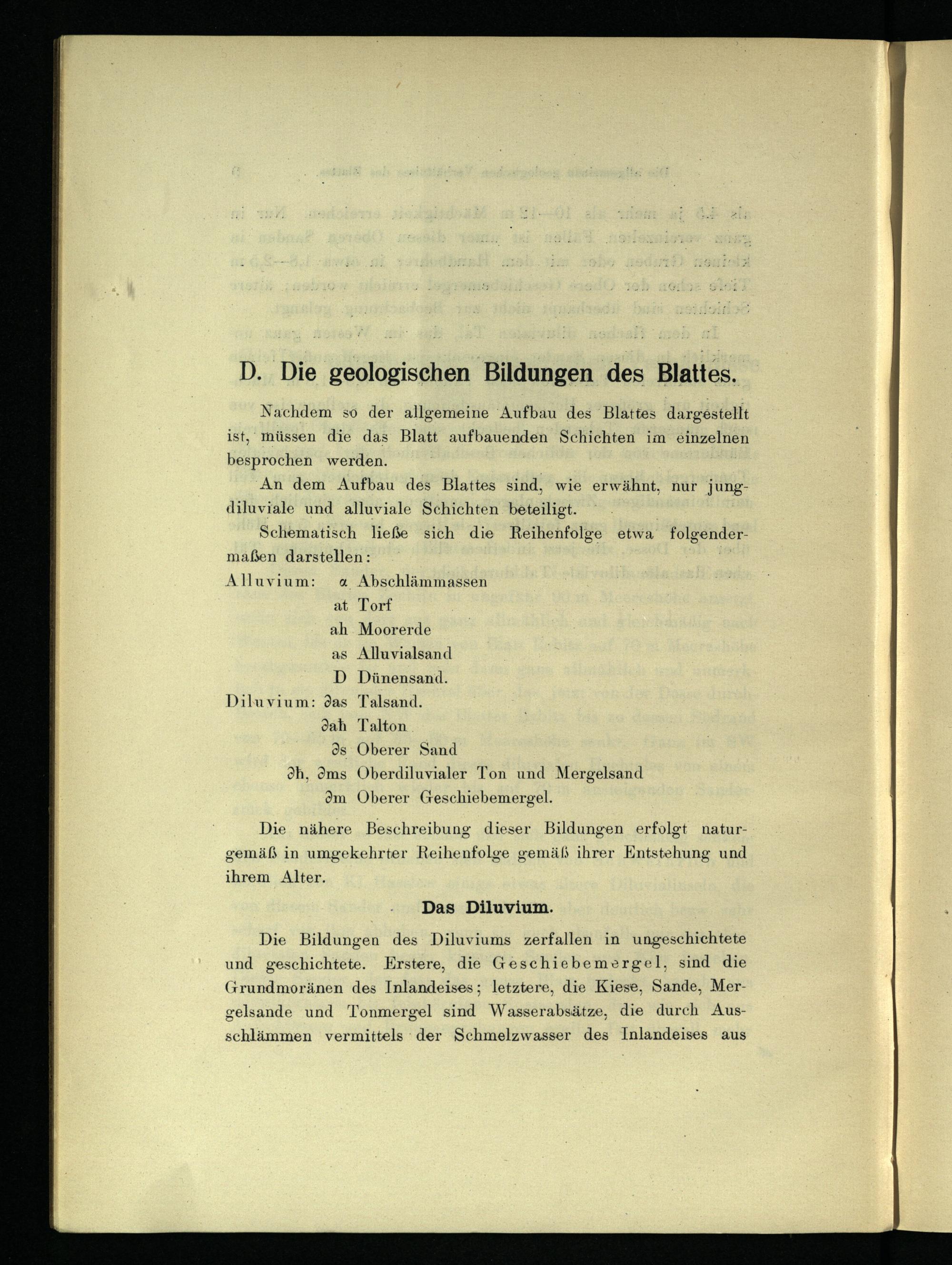 Die Bildungen des Diluviums zerfallen in ungeschichtete und geschichtete. Erstere, die Geschiebemergel, sind die Grundmoränen des Inlandeises; letztere, die Kiese, Sande, Mergelsande und Tonmergel sind Wasserabsätze, die durch Aus- schlämmen vermittels der Schmelzwasser des Inlandeises aus