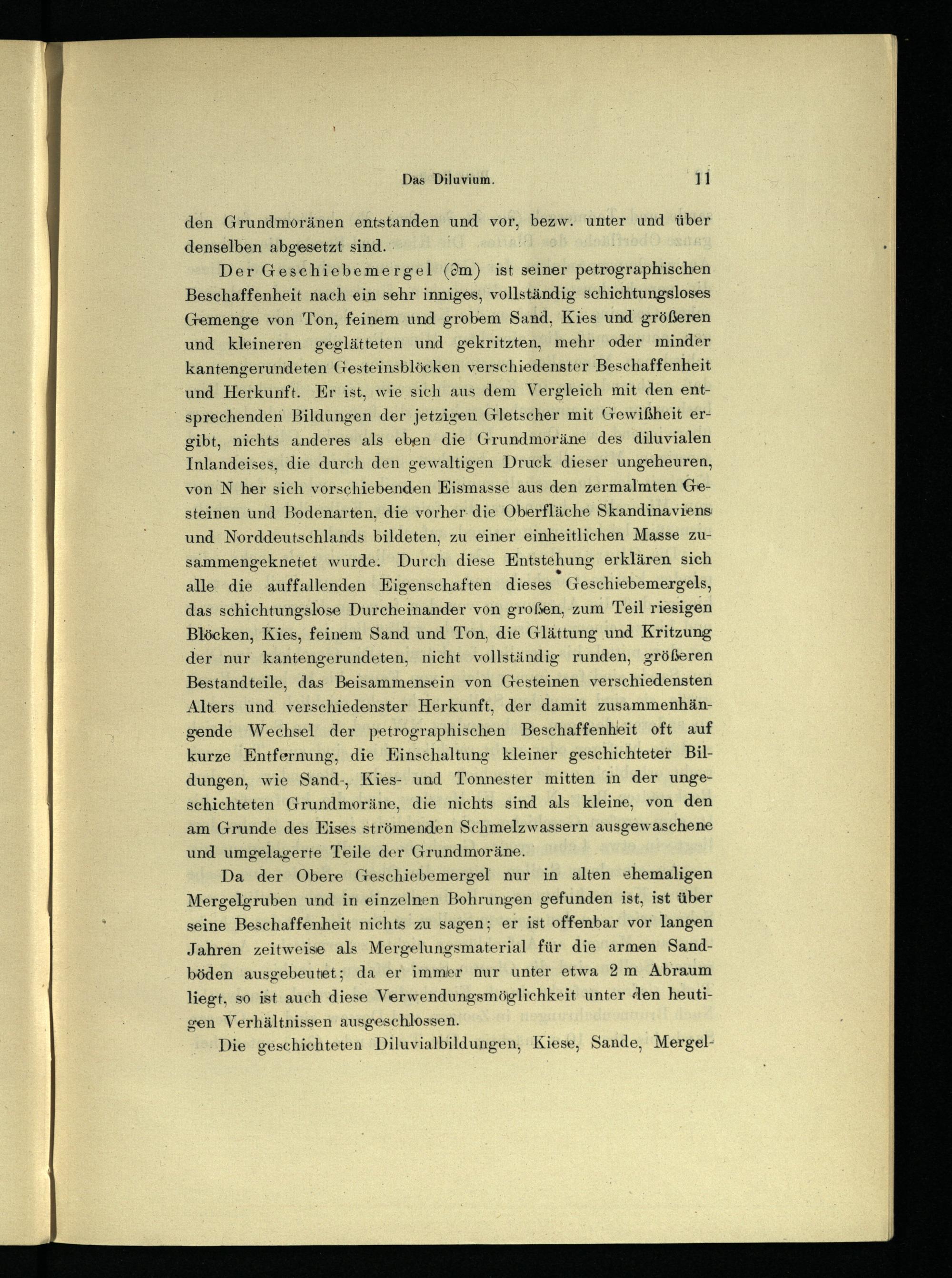 Der Geschiebemergel (5m) ist seiner petrographischen Beschaffenheit nach ein sehr inniges, vollständig schichtungsloses Gemenge von Ton, feinem und grobem Sand, Kies und größeren und kleineren geglätteten und gekritzten, mehr oder minder kantengerundeten Gesteinsblöcken verschiedenster Beschaffenheit und Herkunft. Er ist, wie sich aus dem Vergleich mit den entsprechenden Bildungen der jetzigen Gletscher mit Gewißheit ergibt, nichts anderes als eben die Grundmoräne des diluvialen Inlandeises, die durch den gewaltigen Druck dieser ungeheuren, von N her sich vorschiebenden Eismasse aus den zermalmten Gesteinen und Bodenarten, die vorher die Oberfläche Skandinaviens : und Norddeutschlands bildeten, zu einer einheitlichen Masse zusammengeknetet wurde. Durch diese Entstehung erklären sich alle die auffallenden Eigenschaften dieses Geschiebemergels, das schichtungslose Durcheinander von großen, zum Teil riesigen Blöcken, Kies, feinem Sand und Ton, die Glättung und Kritzung der nur kantengerundeten, nicht vollständig runden, größeren Bestandteile, das Beisammensein von Gesteinen verschiedensten Alters und verschiedenster Herkunft, der damit zusammenhängende Wechsel der petrographischen Beschaffenheit oft auf kurze Entfernung, die Einschaltung kleiner geschichteter Bildungen, wie Sand-, Kies- und Tonnester mitten in der ungeschichteten Grundmoräne, die nichts sind als kleine, von den am Grunde des Eises strömenden Schmelzwassern ausgewaschene und umgelagerre Teile der Grundmoräne.