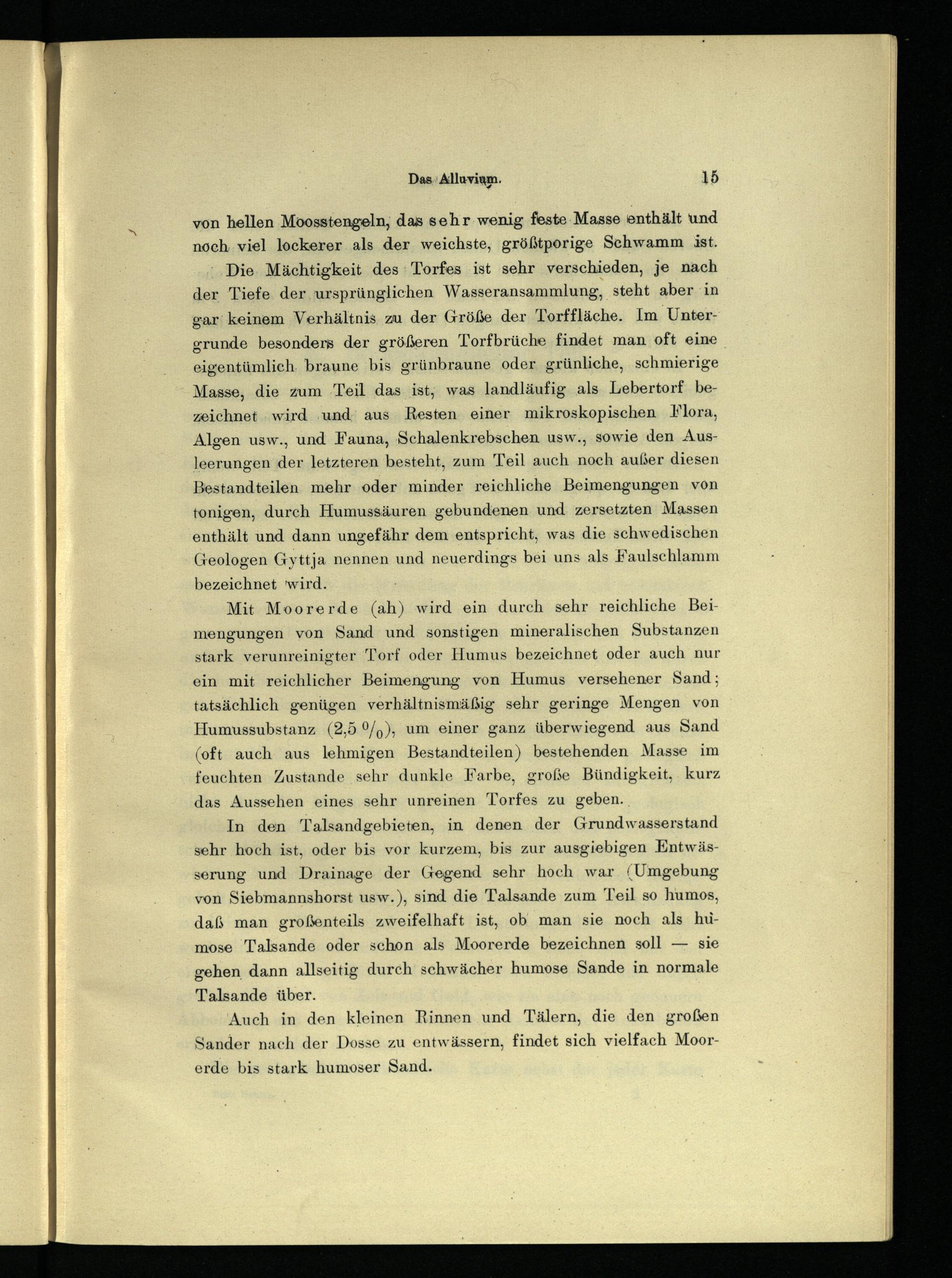 Die Mächtigkeit des Torfes ist sehr verschieden, je nach der Tiefe der ursprünglichen Wasseransammlung, steht aber in gar keinem Verhältnis zu der Größe der Torffläche. Im Untergrunde besondere der größeren Torfbrüche findet man oft eine eigentümlich braune bis grünbraune oder grünliche, schmierige Masse, die zum Teil das ist, was landläufig als Lebertorf bezeichnet wird und aus Resten einer mikroskopischen Flora, Algen usw., und Fauna, Schalenkrebschen usw., sowie den Ausleerungen der letzteren besteht, zum Teil auch noch außer diesen Bestandteilen mehr oder minder reichliche Beimengungen von tonigen, durch Humussäuren gebundenen und zersetzten Massen enthält und dann ungefähr dem entspricht, was die schwedischen Geologen Gyttja nennen und neuerdings bei uns als Faulschlamm bezeichnet 'wird.