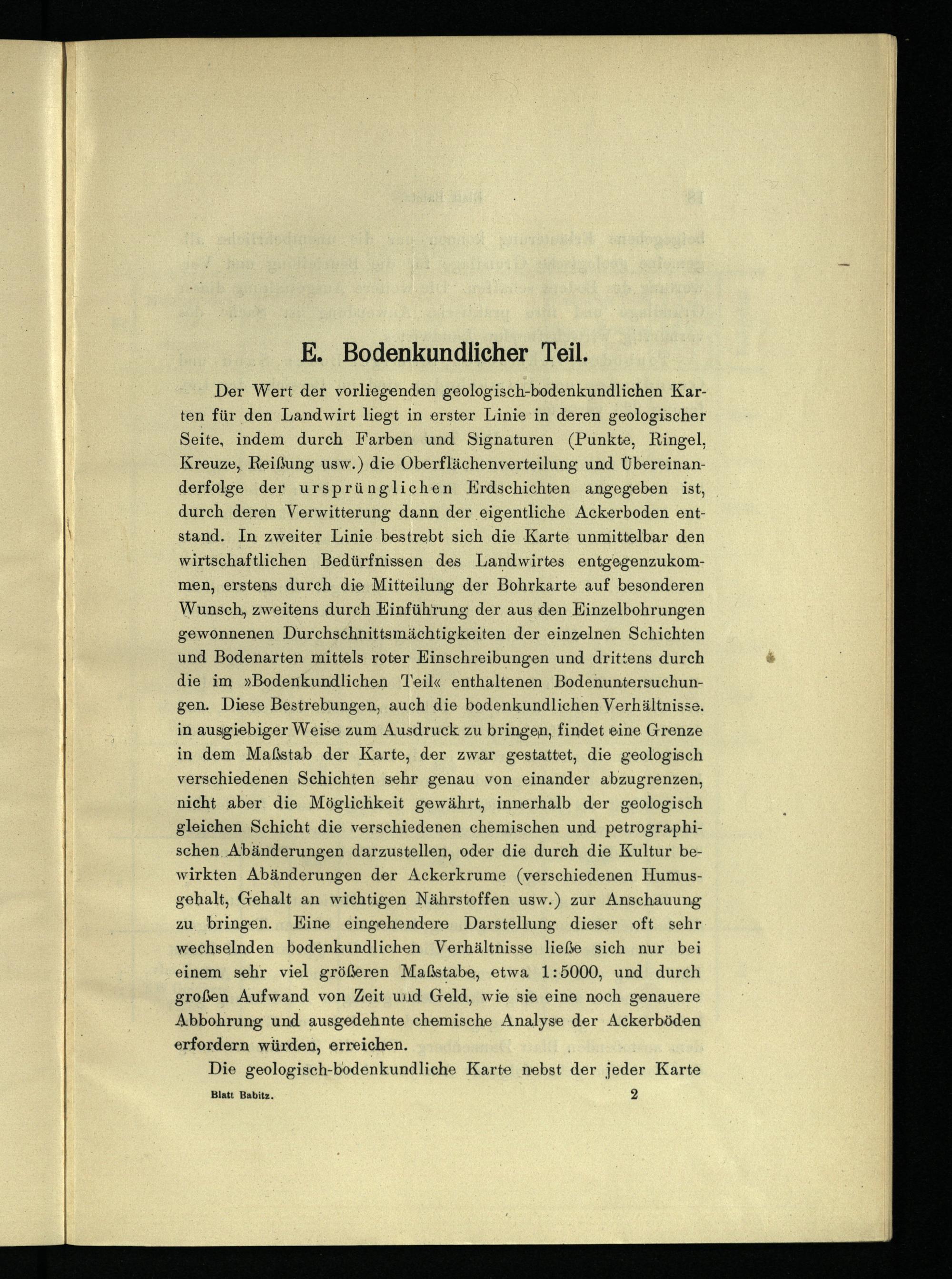 Der Wert der vorliegenden geologisch-bodenkundlichen Karten für den Landwirt liegt in erster Linie in deren geologischer Seite, indem durch Farben und Signaturen (Punkte, Ringel. Kreuze, Reibung usw.) die Oberflächenverteilung und Übereinanderfolge der ursprünglichen Erdschichten angegeben ist, durch deren Verwitterung dann der eigentliche Ackerboden entstand. In zweiter Linie bestrebt sich die Karte unmittelbar den wirtschaftlichen Bedürfnissen des Landwirtes entgegenzukommen, erstens durch die Mitteilung der Bohrkarte auf besonderen Wunsch, zweitens durch Einführung der aus den Einzelbohrungen gewonnenen Durchschnittsmächtigkeiten der einzelnen Schichten und Bodenarten mittels roter Einschreibungen und drittens durch die im »Bodenkundlichen Teil« enthaltenen Bodenuntersuchungen. Diese Bestrebungen, auch die bodenkundlichen Verhältnisse, in ausgiebiger Weise zum Ausdruck zu bringen, findet eine Grenze in dem Maßstab der Karte, der zwar gestattet, die geologisch verschiedenen Schichten sehr genau von einander abzugrenzen, nicht aber die Möglichkeit gewährt, innerhalb der geologisch gleichen Schicht die verschiedenen chemischen und petrographi- schen Abänderungen darzustellen, oder die durch die Kultur bewirkten Abänderungen der Ackerkrume (verschiedenen Humusgehalt, Gehalt an wichtigen Nährstoffen usw.) zur Anschauung zu bringen. Eine eingehendere Darstellung dieser oft sehr wechselnden bodenkundlichen Verhältnisse ließe sich nur bei einem sehr viel größeren Maßstabe, etwa 1:5000, und durch großen Aufwand von Zeit und Geld, wie sie eine noch genauere Abbohrung und ausgedehnte chemische Analyse der Ackerböden erfordern würden, erreichen.