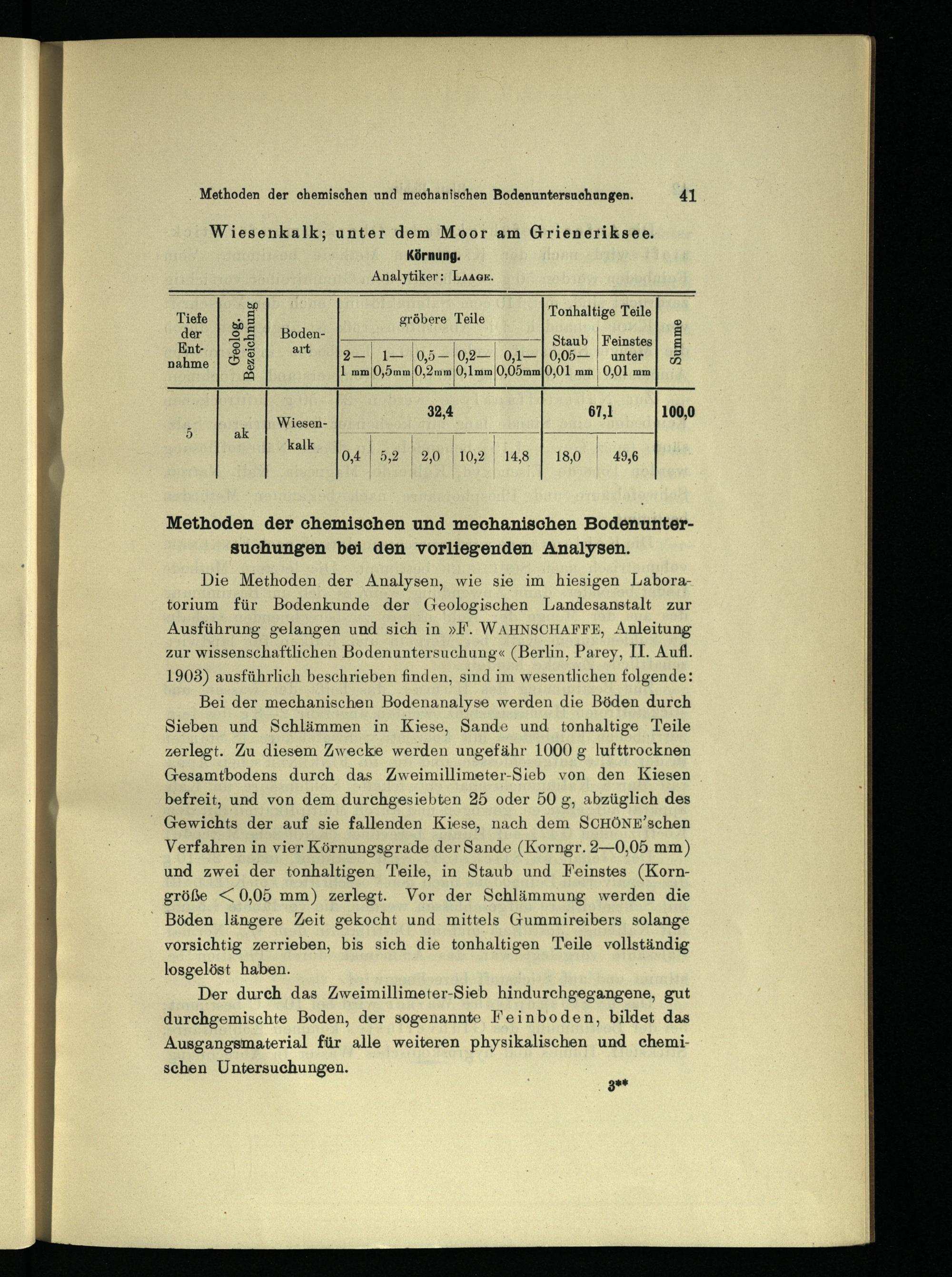 Die Methoden der Analysen, wie sie im hiesigen Laboratorium für Bodenkunde der Geologischen Landesanstalt zur Ausführung gelangen und sich in »F. WAHNSCHAFFE , Anleitung zur wissenschaftlichen Bodenuntersuchung« (Berlin , Parey, II. Aufl. 1903) ausführlich beschrieben finden, sind im wesentlichen folgende: