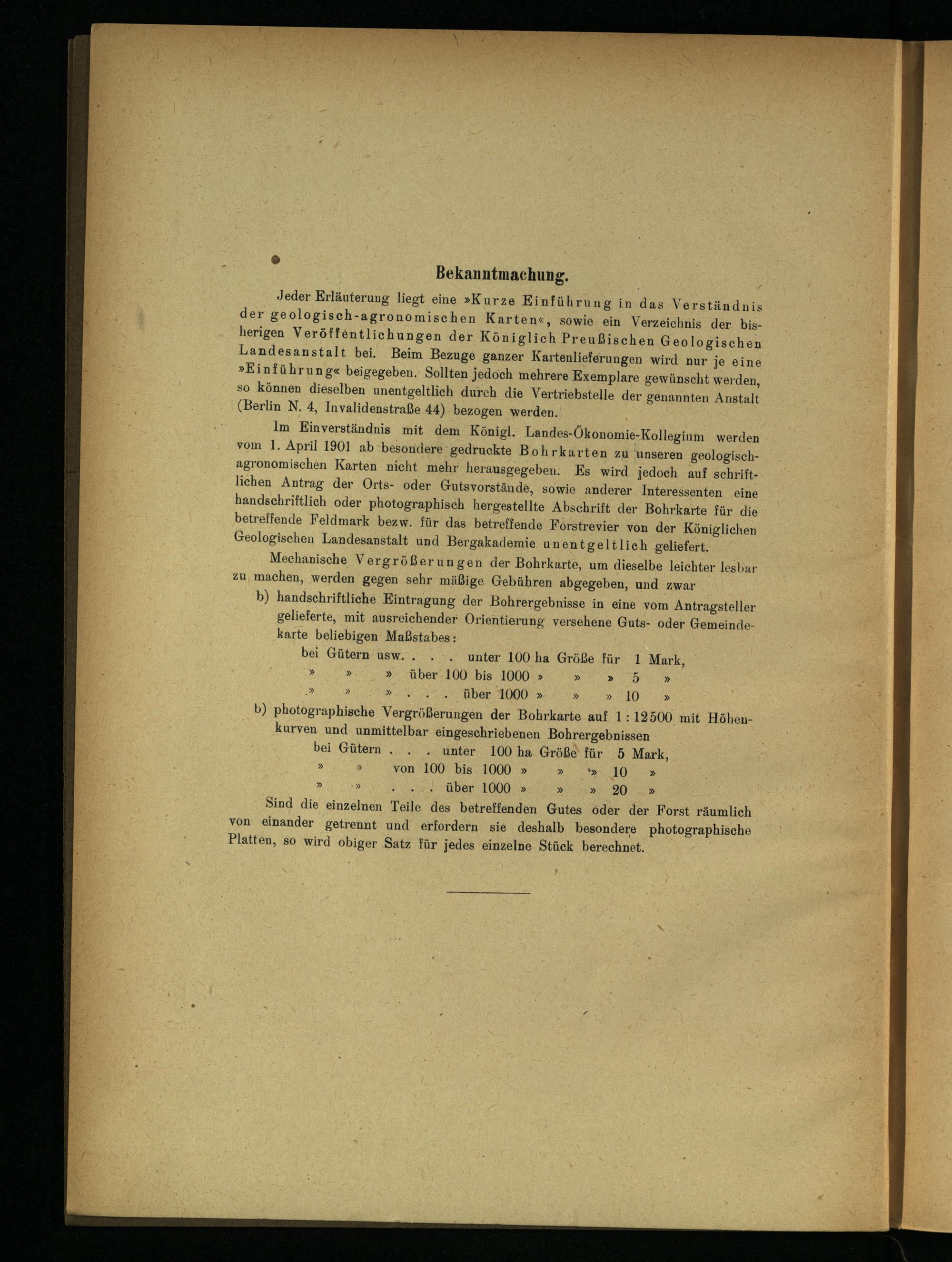 Im Einverständnis mit dem Königl. Landes- Ökonomie- Kollegium werden vom 1. April 1901 ab besondere gedruckte Bohrkarten zu unseren geologischagronomischen Karten nicht mehr herausgegeben. Es wird jedoch auf schriftlichen Antrag der Orts- oder Gutsvorstände, sowie anderer Interessenten eine handschriftlich oder photographisch hergestellte Abschrift der Bohrkarte für die betreffende Feldmark bezw. für das betreffende Forstrevier von der Königlichen Geologischen Landesanstalt und Bergakademie unentgeltlich geliefert.