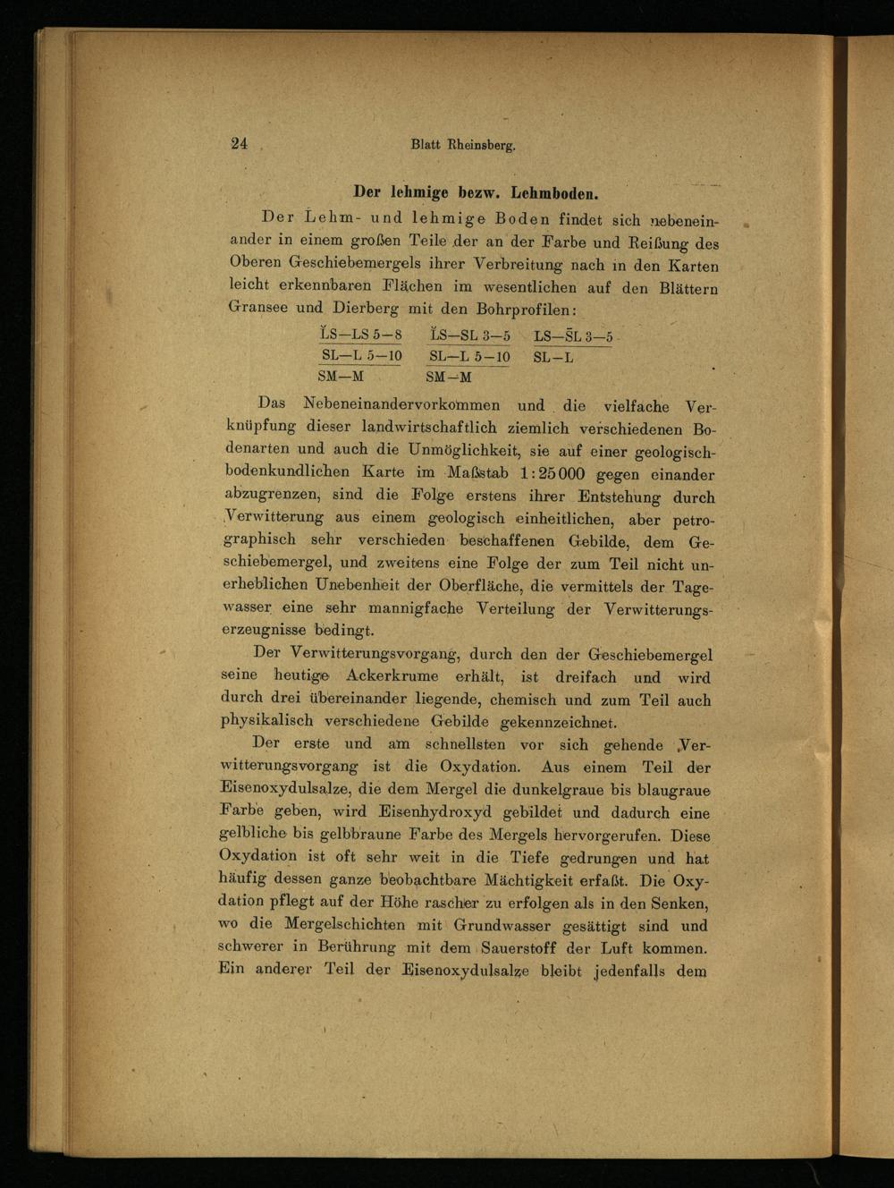 Der Lehm- und lehmige Boden findet sich nebeneinander in einem großen Teile der an der Farbe und Reißung des Oberen Geschiebemergels ihrer Verbreitung nach in den Karten leicht erkennbaren Flächen im wesentlichen auf den Blättern Gransee und Dierberg mit den Bohrprofilen: