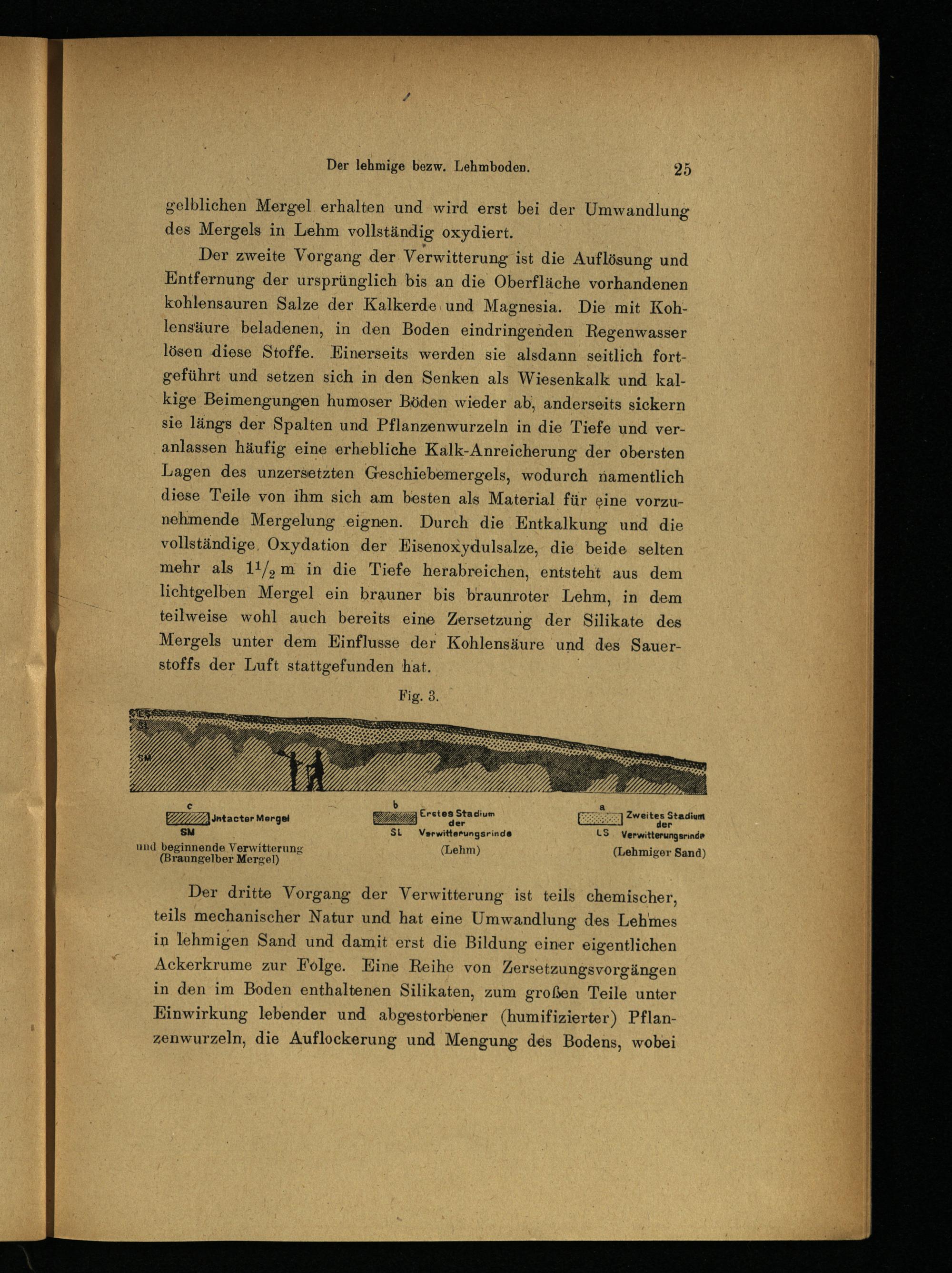 Der zweite Vorgang der Verwitterung ist die Auflösung und Entfernung der ursprünglich bis an die Oberfläche vorhandenen kohlensauren Salze der Kalkerde und Magnesia. Die mit Kohlensäure beladenen, in den Boden eindringenden Regenwasser lösen diese Stoffe. Einerseits werden sie alsdann seitlich fortgeführt und setzen sich in den Senken als Wiesenkalk und kalkige Beimengungen humoser Böden wieder ab, anderseits sickern sie längs der Spalten und Pflanzenwurzeln in die Tiefe und veranlassen häufig eine erhebliche Kalk-Anreicherung der obersten Lagen des unzersetzten Geschiebemergels, wodurch namentlich diese Teile von ihm sich am besten als Material für eine vorzunehmende Mergelung eignen. Durch die Entkalkung und die vollständige. Oxydation der Eisenoxydulsalze, die beide selten mehr als ld/g m in die Tiefe herabreichen, entsteht aus dem lichtgelben Mergel ein brauner bis braunroter Lehm, in dem teilweise wohl auch bereits eine Zersetzung der Silikate des Mergels unter dem Einflüsse der Kohlensäure und des Sauerstoffs der Luft stattgefunden hat.