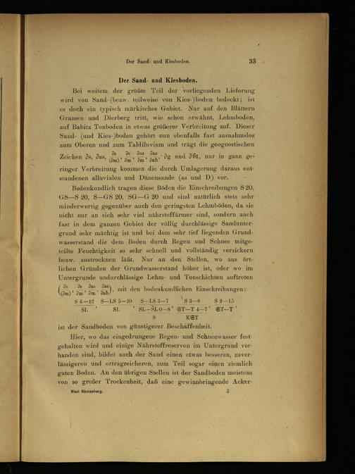 Bodenkundlich tragen diese Böden die Einschreibungen S 20, GS—S 20, S—GS 20, SG—G 20 und sind natürlich stets sehr minderwertig gegenüber auch den geringsten Lehmböden, da sie nicht nur an sich sehr viel nährstoffärmer sind, sondern auch fast in dem ganzen Gebiet der völlig durchlässige Sanduntergrund sehr mächtig ist und bei dem sehr tief liegenden Grundwasserstand die dem Boden durch Regen und Schnee mitgeteilte Feuchtigkeit so sehr schnell und vollständig versickern bezw. austrocknen läßt. Nur an den Stellen, wo aus örtlichen Gründen der Grundwasserstand höher ist, oder wo im Untergrunde undurchlässige Lehm- und Tonschichten auftreten