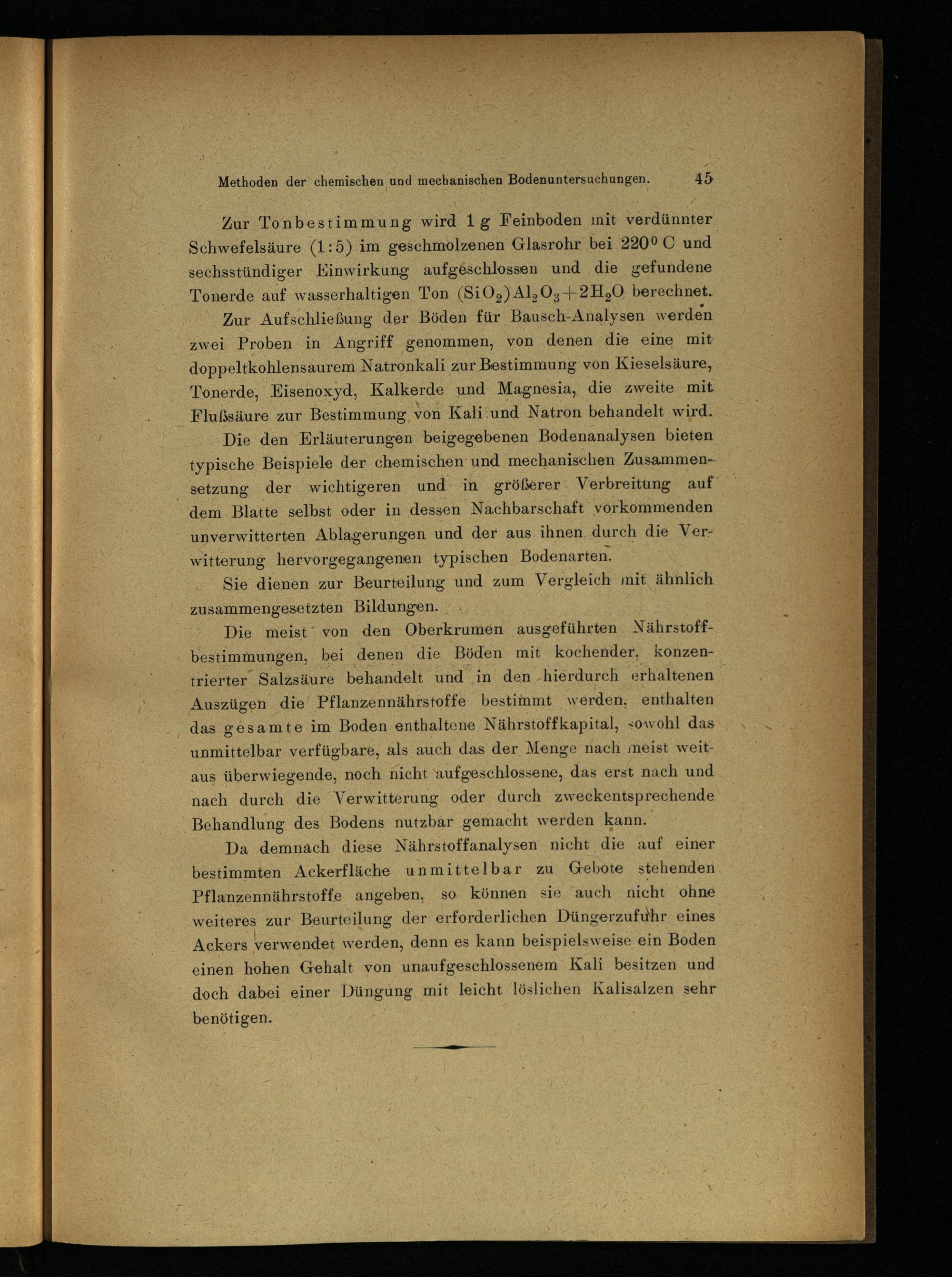 Zur Aufschließuug der Böden für Bausch-Analysen werden zwei Proben in Angriff genommen, von denen die eine mit doppeltkohlensaurem Natronkali zur Bestimmung von Kieselsäure, Tonerde, Eisenoxyd, Kalkerde und Magnesia, die zweite mit Flußsäure zur Bestimmung von Kali und Natron behandelt wird.