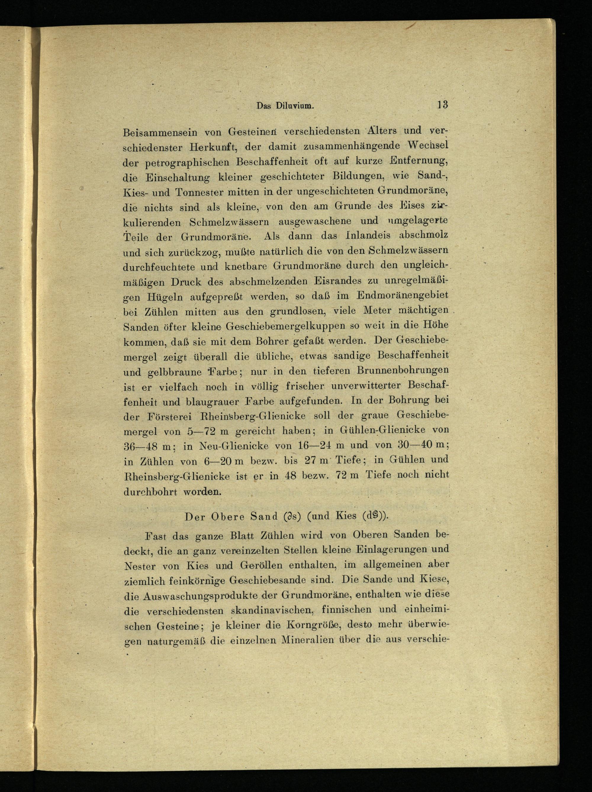 Beisammensein von Gesteinen verschiedensten Alters und verschiedenster Herkunft, der damit zusammenhängende Wechsel der petrographischen Beschaffenheit oft auf kurze Entfernung, die Einschaltung kleiner geschichteter Bildungen, wie Sand-, Kies- und Tonnester mitten in der ungeschichteten Grundmoräne, die nichts sind als kleine, von den am Grunde des Eises zirkulierenden Schmelzwässern ausgewaschene und umgelagerte Teile der Grundmoräne. Als dann das Inlandeis abschmolz und sich zurückzog, mußte natürlich die von den Schmelzwässern durchfeuchtete und knetbare Grundmoräne durch den ungleichmäßigen Druck des abschmelzenden Eisrandes zu unregelmäßigen Hügeln aufgepreßt werden, so daß im Endmoränengebiet bei Zühlen mitten aus den grundlosen, viele Meter mächtigen Sanden öfter kleine Geschiebemergelkuppen so weit in die Höhe kommen, daß sie mit dem Bohrer gefaßt werden. Der Geschiebemergel zeigt überall die übliche, etwas sandige Beschaffenheit und gelbbraune 'Farbe; nur in den tieferen Brunnenbohrungen ist er vielfach noch in völlig frischer unverwitterter Beschaffenheit und blaugrauer Farbe aufgefunden. In der Bohrung bei der Försterei Rheinsberg-Glienicke soll der graue Geschiebemergel von 5—72 m gereicht haben; in Gühlen-Glienicke von 36—48 m; in Neu-Glienicke von 16—24 m und von 30—40 m; in Zühlen von 6—20m bezw. bis 27 m Tiefe; in Gühlen und Rheinsberg-Glienicke ist er in 48 bezw. 72 m Tiefe noch nicht durchbohrt worden.