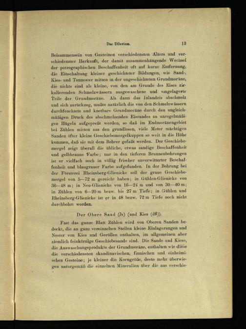 Fast das ganze Blatt Zühlen wird von Oberen Sanden bedeckt, die an ganz vereinzelten Stellen kleine Einlagerungen und Nester von Kies und Geröllen enthalten, im allgemeinen aber ziemlich feinkörnige Geschiebesande sind. Die Sande und Kiese , die Auswaschungsprodukte der Grundmoräne, enthalten wie diese die verschiedensten skandinavischen, finnischen und einheimischen Gesteine; je kleiner die Korngröße, desto mehr überwiegen naturgemäß die einzelnen Mineralien über die aus verschie-