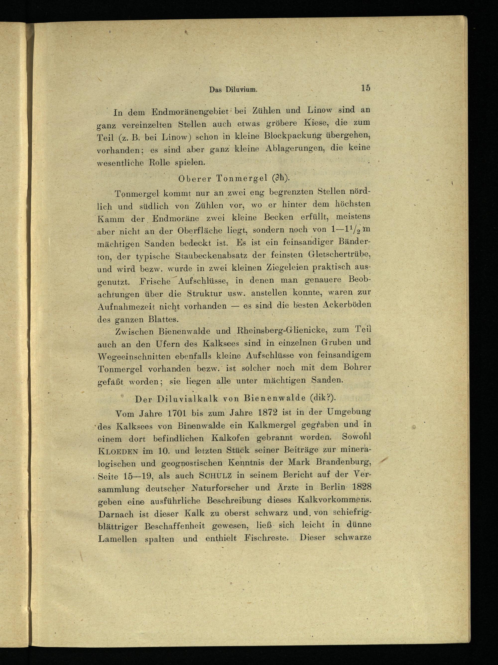 Vom Jahre 1701 bis zum Jahre 1872 ist in der Umgebung des Kalksees von Binenwalde ein Kalkmergel gegraben und in einem dort befindlichen Kalkofen gebrannt worden. Sowohl KLOEDEN i m 10. und letzten Stück seiner Beiträge zur mineralogischen und geognostischen Kenntnis der Mark Brandenburg, Seite 15—19, als auch SCHULZ in seinem Bericht auf der Versammlung deutscher Naturforscher und Ärzte in Berlin 1828 geben eine ausführliche Beschreibung dieses Kalkvorkommens. Darnach ist dieser Kalk zu oberst schwarz und. von schiefrig- blättriger Beschaffenheit gewesen, ließ sich leicht in dünne Lamellen spalten und enthielt Fischreste. Dieser schwarze