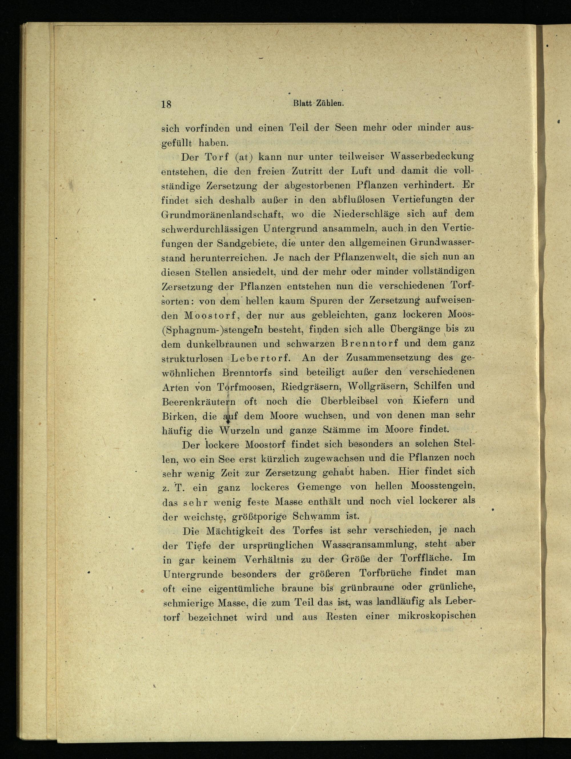 Der Torf (at) kann nur unter teilweiser Wasserbedeckung entstehen, die den freien Zutritt der Luft und damit die vollständige Zersetzung der abgestorbenen Pflanzen verhindert. Er findet sich deshalb außer in den abflußlosen Vertiefungen der Grundmoränenlandschaft, wo die Niederschläge sich auf dem schwerdurchlässigen Untergrund ansammeln, auch, in den Vertiefungen der Sandgebiete, die unter den allgemeinen Grundwasserstand herunterreichen. Je nach der Pflanzenwelt, die sich nun an diesen Stellen ansiedelt, und der mehr oder minder vollständigen Zersetzung der Pflanzen entstehen nun die verschiedenen Torfsorten: von dem hellen kaum Spuren der Zersetzung aufweisenden Moostorf, der nur aus gebleichten, ganz lockeren Moos- (Sphagnum-)stengeln besteht, finden sich alle Übergänge bis zu dem dunkelbraunen und schwarzen Brenntorf und dem ganz strukturlosen Lebertorf. An der Zusammensetzung des gewöhnlichen Brenntorfs sind beteiligt außer den verschiedenen Arten von Torfmoosen, Riedgräsern, Wollgräsern, Schilfen und Beerenkräutern oft noch die Überbleibsel von Kiefern und Birken, die auf dem Moore wuchsen, und von denen man sehr häufig die Wurzeln und ganze Stämme im Moore findet.