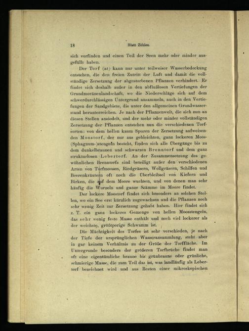 Der lockere Moostorf findet sich besonders an solchen Stellen, wo ein See erst kürzlich zugewachsen und die Pflanzen noch sehr wenig Zeit zur Zersetzung gehabt haben. Hier findet sich z. T. ein ganz lockeres Gemenge von hellen Moosstengeln, das sehr wenig feste Masse enthält und noch viel lockerer als der weichste, größtporige Schwamm ist.