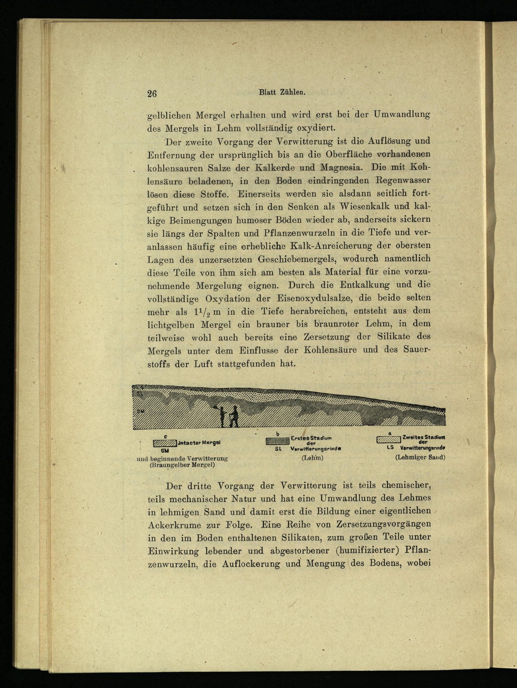 Der zweite Vorgang der Verwitterung ist die Auflösung und Entfernung der ursprünglich bis an die Oberfläche vorhandenen kohlensauren Salze der Kalkerde und Magnesia. Die mit Kohlensäure beladenen, in den Boden eindringenden Regenwasser lösen diese Stoffe. Einerseits werden sie alsdann seitlich fortgeführt und setzen sich in den Senken als Wiesenkalk und kalkige Beimengungen humoser Böden wieder ab, anderseits sickern sie längs der Spalten und Pflanzenwurzeln in die Tiefe und veranlassen häufig eine erhebliche Kalk-Anreicherung der obersten Lagen des unzersetzten Geschiebemergels, wodurch namentlich diese Teile von ihm sich am besten als Material für eine vorzunehmende Mergelung eignen. Durch die Entkalkung und die vollständige Oxydation der Eisenoxydulsalze, die beide selten mehr als l 1 / 2 m in die Tiefe herabreichen, entsteht aus dem lichtgelben Mergel ein brauner bis braunroter Lehm, in dem teilweise wohl auch bereits eine Zersetzung der Silikate des Mergels unter dem Einflüsse der Kohlensäure und des Sauerstoffs der Luft stattgefünden hat.
