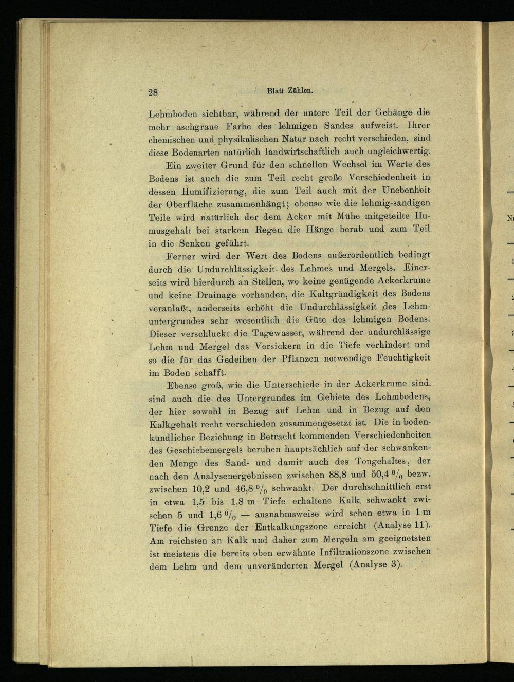 Ferner wird der Wert des Bodens außerordentlich bedingt durch die Undurchlässigkeit- des Lehmes und Mergels. Einerseits wird hierdurch an Stellen, wo keine genügende Ackerkrume und keine Drainage vorhanden, die Kaltgründigkeit des Bodens veranlaßt, anderseits erhöht die Undurchlässigkeit des Lehmuntergrundes sehr wesentlich die Güte des lehmigen Bodens. Dieser verschluckt die Tagewasser, während der undurchlässige Lehm und Mergel das Versickern in die Tiefe verhindert und so die für das Gedeihen der Pflanzen notwendige Feuchtigkeit im Boden schafft.