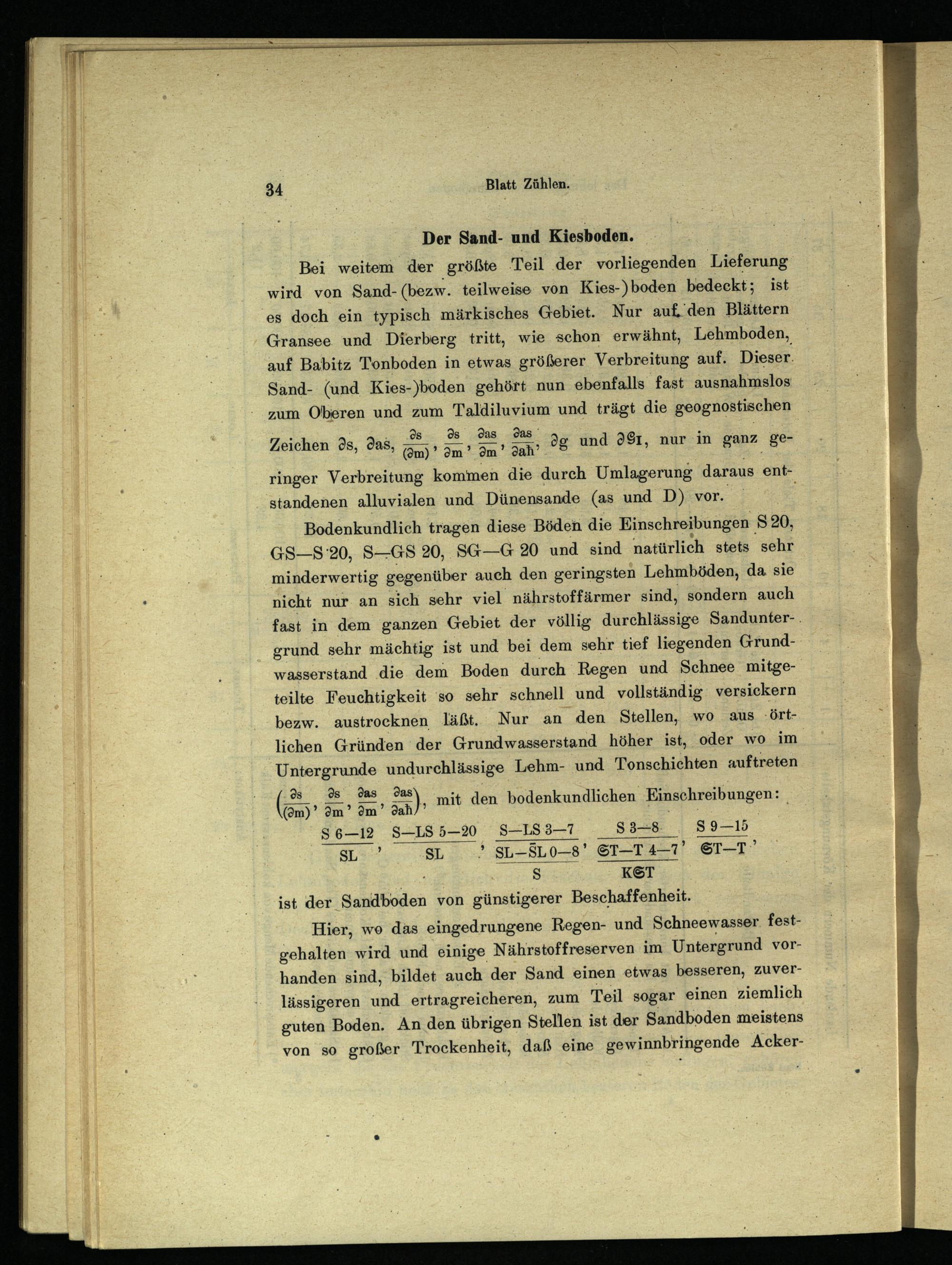 Bodenkundlich tragen diese Böden die Einschreibungen S 20, GS—S'20, S—GS 20, SG—G 20 und sind natürlich stets sehr minderwertig gegenüber auch den geringsten Lehmböden, da sie nicht nur an sich sehr viel nährstoffärmer sind, sondern auch fast in dem ganzen Gebiet der völlig durchlässige Sandunter-. grund sehr mächtig ist und bei dem sehr tief liegenden Grundwasserstand die dem Boden durch Regen und Schnee mitgeteilte Feuchtigkeit so sehr schnell und vollständig versickern bezw. austrocknen läßt. Nur an den Stellen, wo aus örtlichen Gründen der Grundwasserstand höher ist, oder wo im Untergründe undurchlässige Lehm- und Tonschichten auftreten