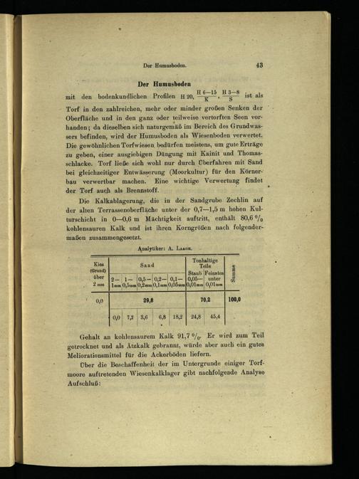 Die Kalkablagerung, die in der Sandgrube Zechlin auf der alten Terrassenoberfläche unter der 0,7—1,5 m hohen Kulturschicht in 0—0,6 m Mächtigkeit auftritt, enthält 80,6 °/ 0 kohlensauren Kalk und ist ihren Korngrößen nach folgendermaßen zusammengesetzt.