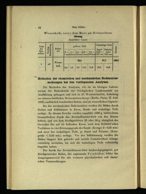 Die Methoden der Analysen, wie sie im hiesigen Laboratorium für Bodenkunde der Geologischen Landesanstalt zur Ausführung gelangen und sich in »F. WAHNSCHAFFE , Anleitung zur wissenschaftlichen Bodenuntersuchung« (Berlin , Parey, XI. Aufl. 1903) ausführlich beschrieben finden, sind im wesentlichen folgende: