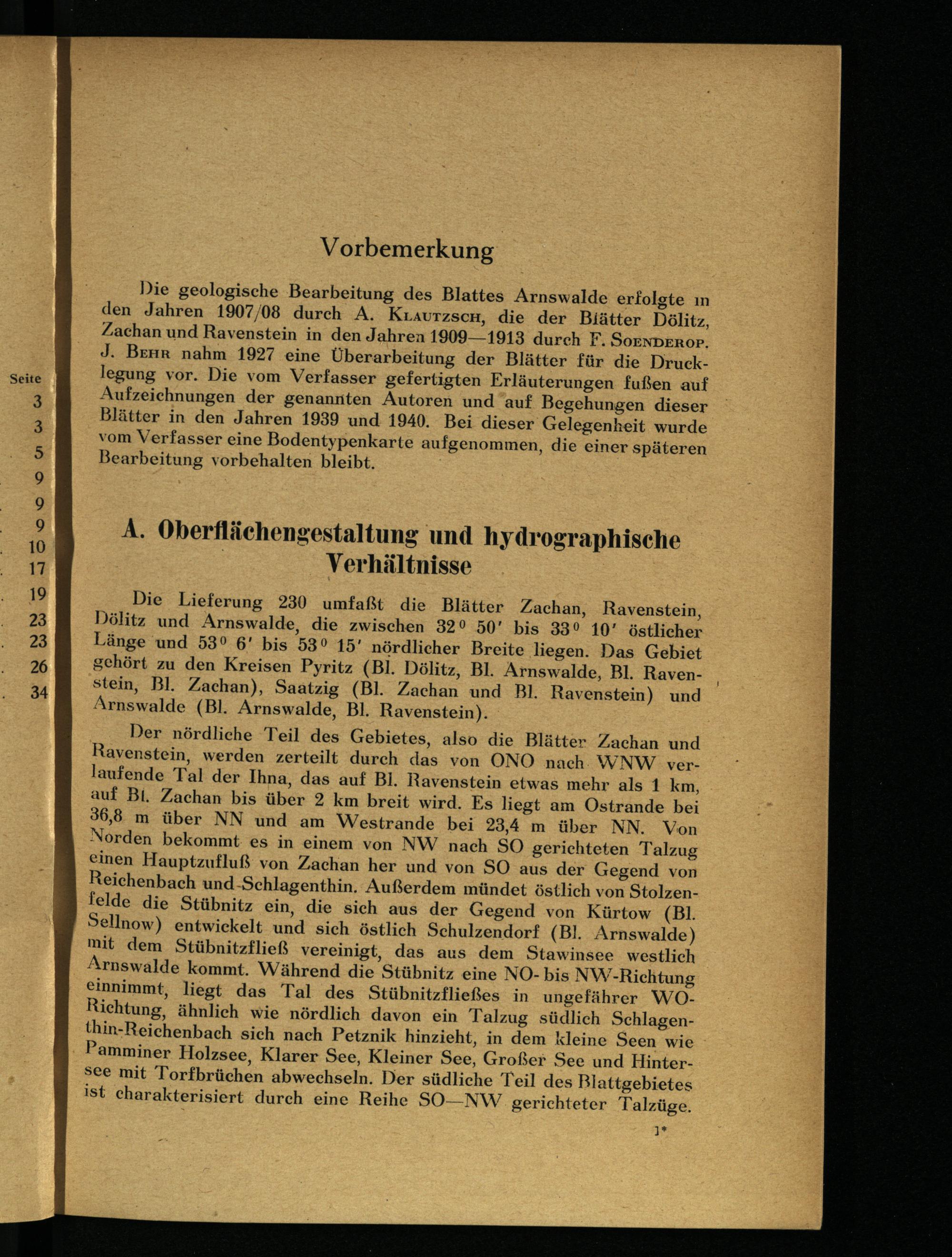 Die geologische Bearbeitung des Blattes Arnswalde erfolgte in den Jahren 1907/08 durch A. Klautzsch, d ie der Blätter Dölitz, Zachan und Ravenstein in den Jahren 1909—1913 durch F. Soenderop. J. Behr nahm 1927 eine Überarbeitung der Blätter für die Drucklegung vor. Die vom Verfasser gefertigten Erläuterungen fußen auf Aufzeichnungen der genannten Autoren und auf Begehungen dieser Blätter in den Jahren 1939 und 1940. Bei dieser Gelegenheit wurde vom Verfasser eine Bodentypenkarte aufgenommen, die einer späteren Bearbeitung Vorbehalten bleibt.