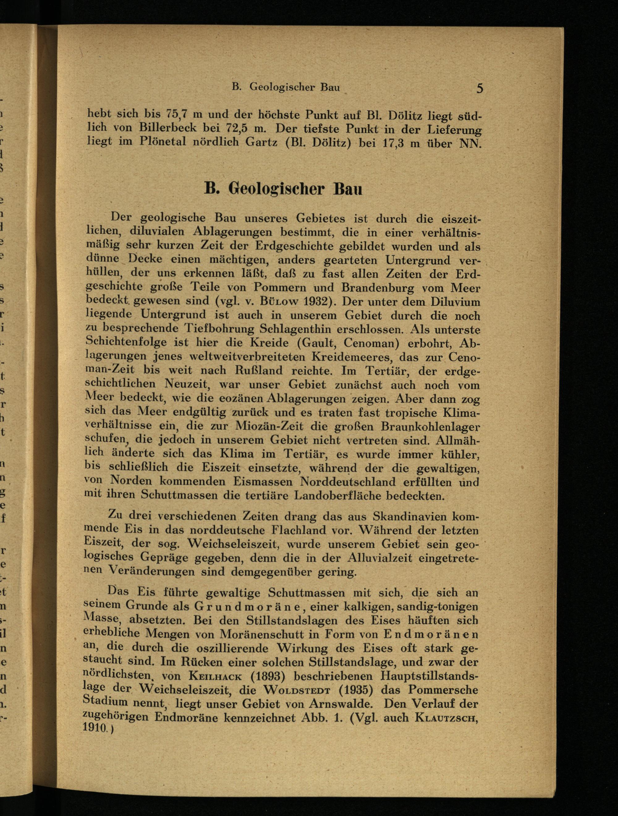 Das Eis führte gewaltige Schuttmassen mit sich, die sich an seinem Grunde als Grundmoräne, einer kalkigen, sandig-tonigen Masse, absetzten. Bei den Stillstandslagen des Eises häuften sich erhebliche Mengen von Moränenschutt in Form von Endmoränen an, die durch die oszillierende Wirkung des Eises oft stark gestaucht sind. Im Rücken einer solchen Stillstandslage, und zwar der nördlichsten, von Keilhack (1893) beschriebenen Hauptstillstands- lage der Weichseleiszeit, die Woldstedt (1935) das Pommersche Stadium nennt, liegt unser Gebiet von Arnswalde . Den Verlauf der zugehörigen Endmoräne kennzeichnet Abb. 1. (Vgl. auch Klautzsch, 1910.)