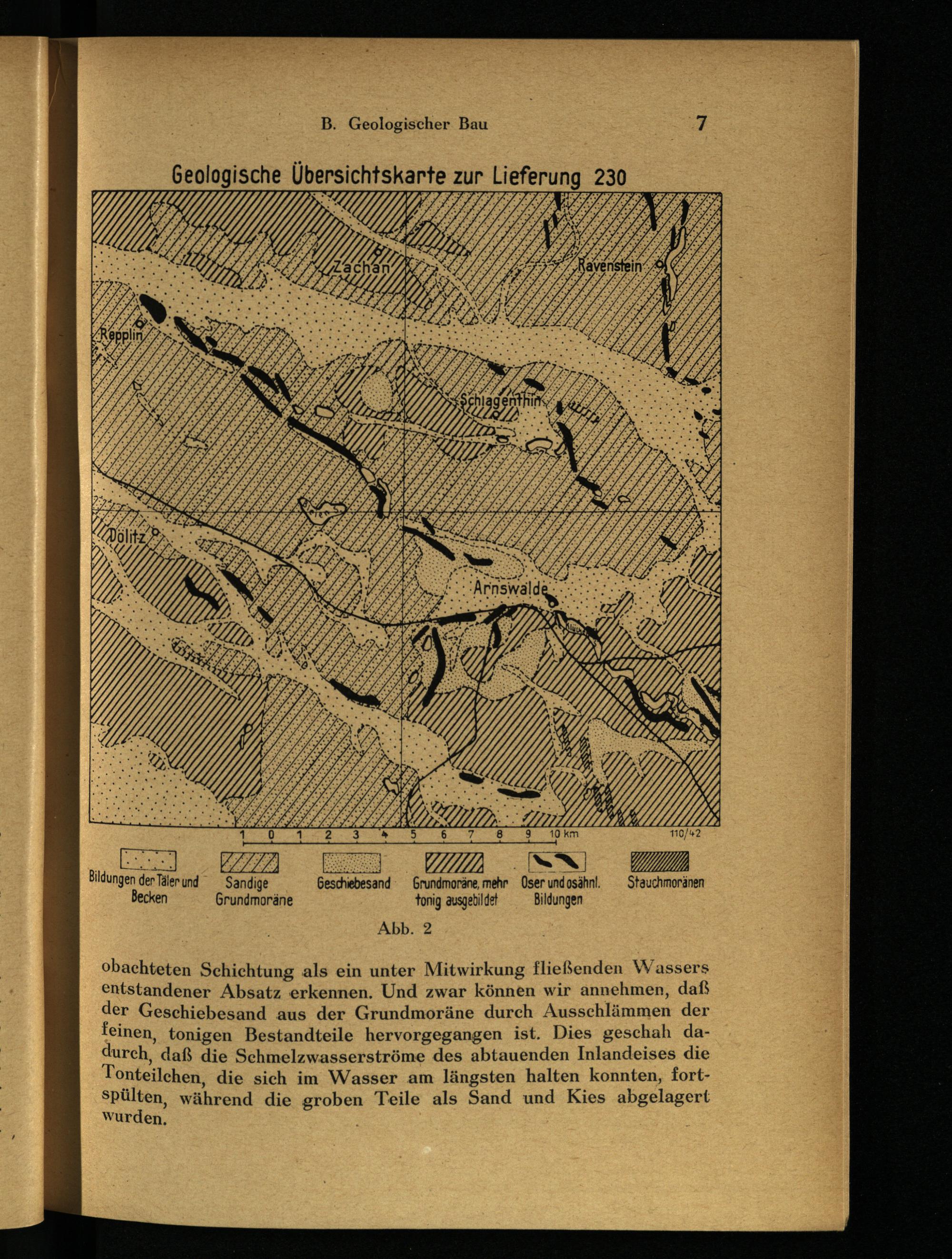 obachteten Schichtung als ein unter Mitwirkung fließenden Wassers entstandener Absatz erkennen. Und zwar können wir annehmen, daß der Geschiebesand aus der Grundmoräne durch Ausschlämmen der feinen, tonigen Bestandteile hervorgegangen ist. Dies geschah dadurch, daß die Schmelzwasserströme des abtauenden Inlandeises die Tonteilchen, die sich im Wasser am längsten halten konnten, fortspülten, während die groben Teile als Sand und Kies abgelagert wurden.