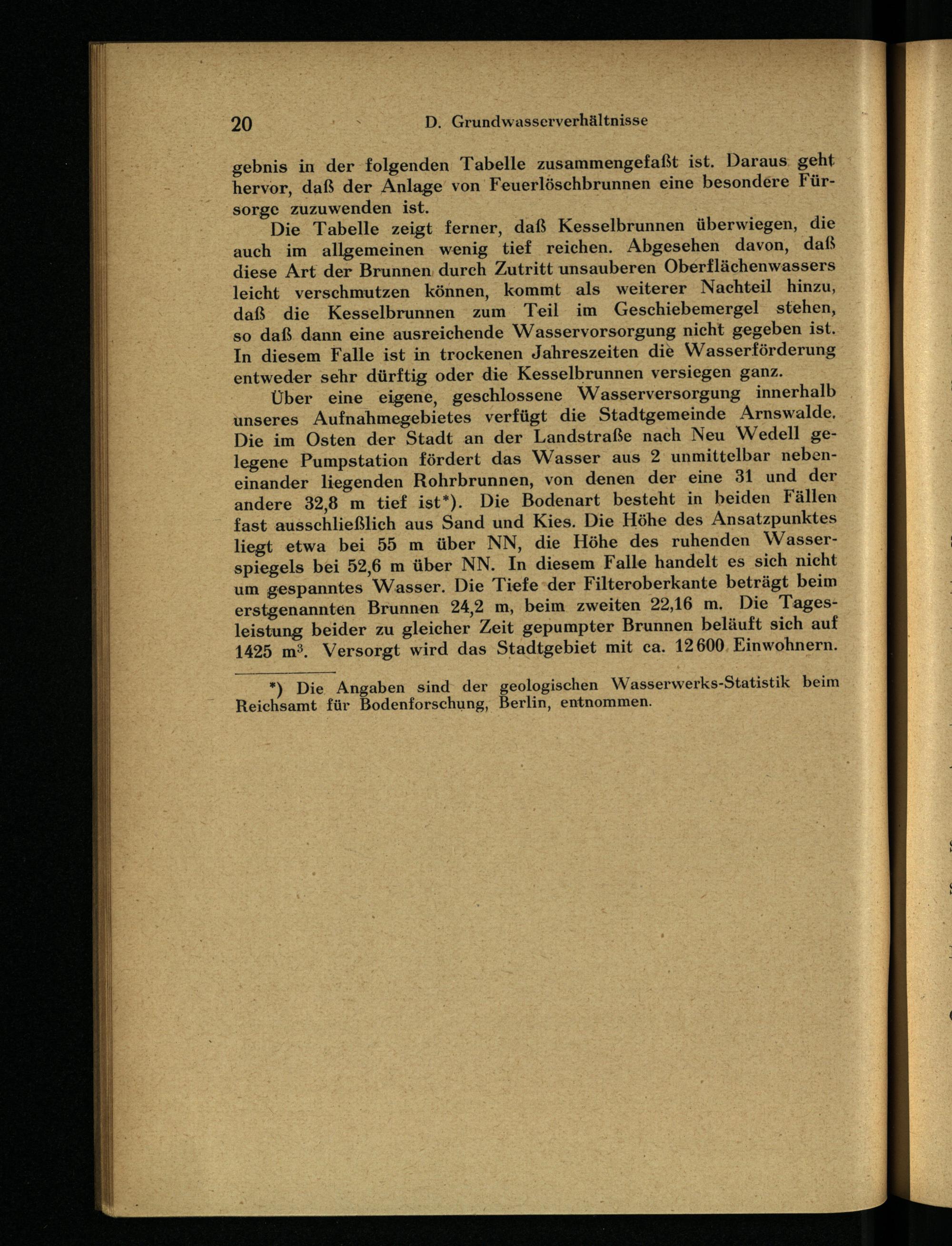Über eine eigene, geschlossene Wasserversorgung innerhalb unseres Aufnahmegebietes verfügt die Stadtgemeinde Arnswalde . Die im Osten der Stadt an der Landstraße nach Neu Wedell gelegene Pumpstation fördert das Wasser aus 2 unmittelbar nebeneinander liegenden Rohrbrunnen, von denen der eine 31 und der andere 32,8 m tief ist*). Die Bodenart besteht in beiden Fällen fast ausschließlich aus Sand und Kies. Die Höhe des Ansatzpunktes liegt etwa bei 55 m über NN, die Höhe des ruhenden Wasserspiegels bei 52,6 m über NN. In diesem Falle handelt es sich nicht um gespanntes Wasser. Die Tiefe der Filteroberkante beträgt beim erstgenannten Brunnen 24,2 m, beim zweiten 22,16 m. Die Tagesleistung beider zu gleicher Zeit gepumpter Brunnen beläuft sich auf 1425 m 3 . Versorgt wird das Stadtgebiet mit ca. 12600 Einwohnern.