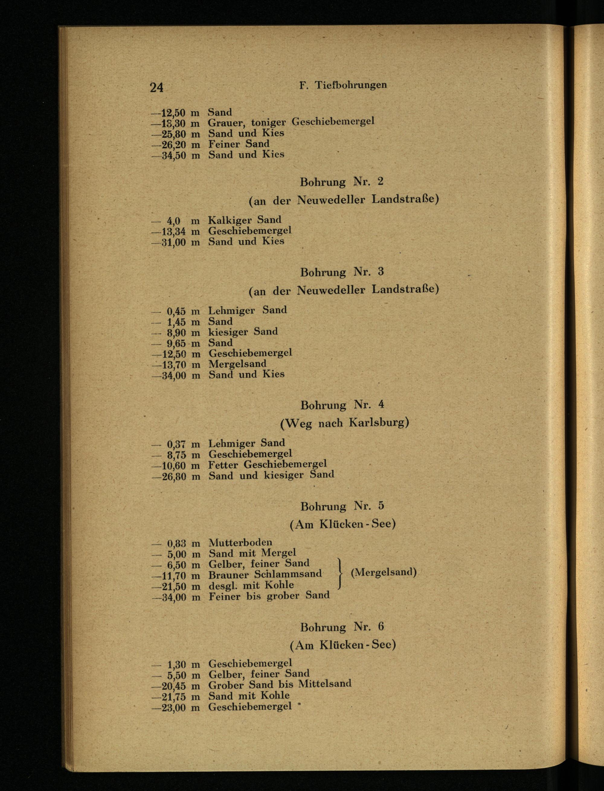 1,30 m Geschiebemergel 5,50 m Gelber, feiner Sand 20,45 m Grober Sand bis Mittelsand 21,75 m Sand mit Kohle 23,00 m Geschiebemergel *