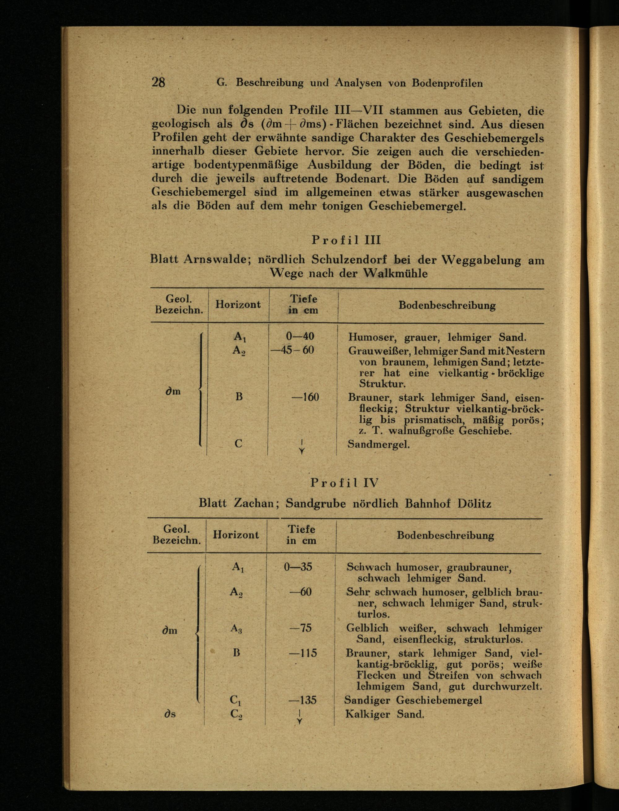 Die nun folgenden Profile III—VII stammen aus Gebieten, die geologisch als ds (dm dms) - Flächen bezeichnet sind. Aus diesen Profilen geht der erwähnte sandige Charakter des Geschiebemergels innerhalb dieser Gebiete hervor. Sie zeigen auch die verschiedenartige bodentypenmäßige Ausbildung der Böden, die bedingt ist durch die jeweils auftretende Bodenart. Die Böden auf sandigem Geschiebemergel sind im allgemeinen etwas stärker ausgewaschen als die Böden auf dem mehr tonigen Geschiebemergel.