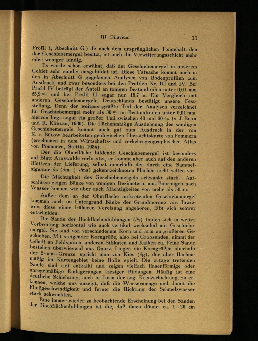 Es wurde schon erwähnt, daß der Geschiebemergel in unserem Gebiet sehr sandig ausgebildet ist. Diese Tatsache kommt auch in den in Abschnitt G gegebenen Analysen von Bodenprofilen zum Ausdruck, und zwar besonders bei den Profilen Nr. III und IV. Bei Profil IV beträgt der Anteil an tonigen Bestandteilen unter 0,01 mm 25,9 o/o und bei Profil II sogar nur 15,7 o/ 0 . Ein Vergleich mit anderen Geschiebemergeln Deutschlands bestätigt unsere Feststellung. Denn der weitaus größte Teil der Analysen verzeichnet für Geschiebemergel mehr als 30 o/o an Bestandteilen unter 0,01 mm, hiervon liegt sogar ein großer Teil zwischen 40 und 60 o/o (s. J. Behr und R. Köhler, 1930). Die flächenmäßige Ausdehnung des sandigen Geschiebemergels kommt auch gut zum Ausdruck in der von K. v. Bülow bearbeiteten geologischen Übersichtskarte von Pommern (erschienen in dem Wirtschafts- und verkehrsgeographischen Atlas von Pommern, Stettin 1934).