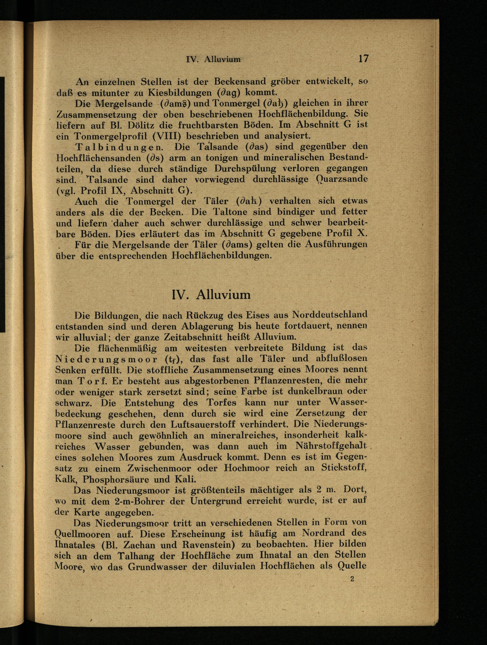 Talbindungen. Die Talsande (das) sind gegenüber den Hochflächensanden (ds) arm an tonigen und mineralischen Bestandteilen, da diese durch ständige Durchspülung verloren gegangen sind. Talsande sind daher vorwiegend durchlässige Quarzsande (vgl. Profil IX, Abschnitt G).