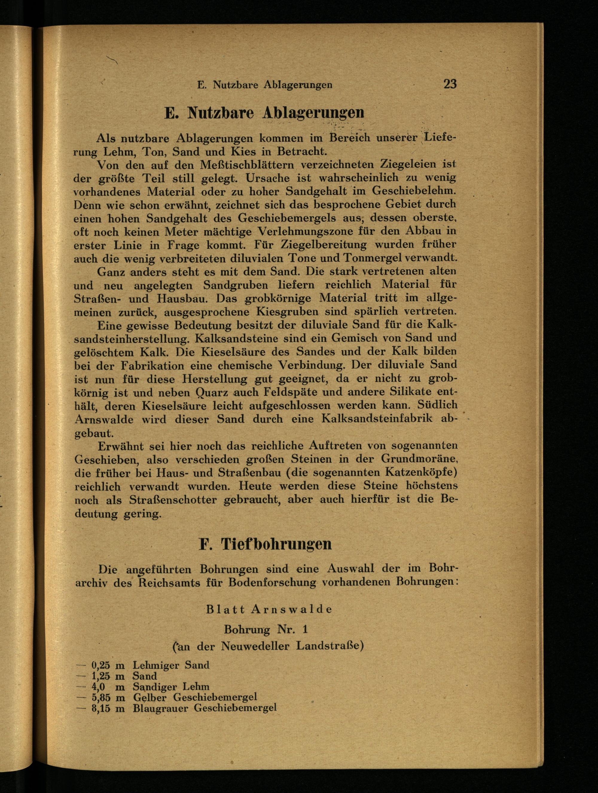 Von den auf den Meßtischblättern verzeichneten Ziegeleien ist der größte Teil still gelegt. Ursache ist wahrscheinlich zu wenig vorhandenes Material oder zu hoher Sandgehalt im Geschiebelehm. Denn wie schon erwähnt, zeichnet sich das besprochene Gebiet durch einen hohen Sandgehalt des Geschiebemergels aus, dessen oberste, oft noch keinen Meter mächtige Verlehmungszone für den Abbau in erster Linie in Frage kommt. Für Ziegelbereitung wurden früher auch die wenig verbreiteten diluvialen Tone und Tonmergel verwandt.